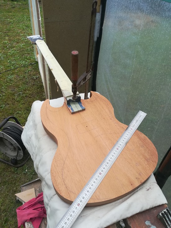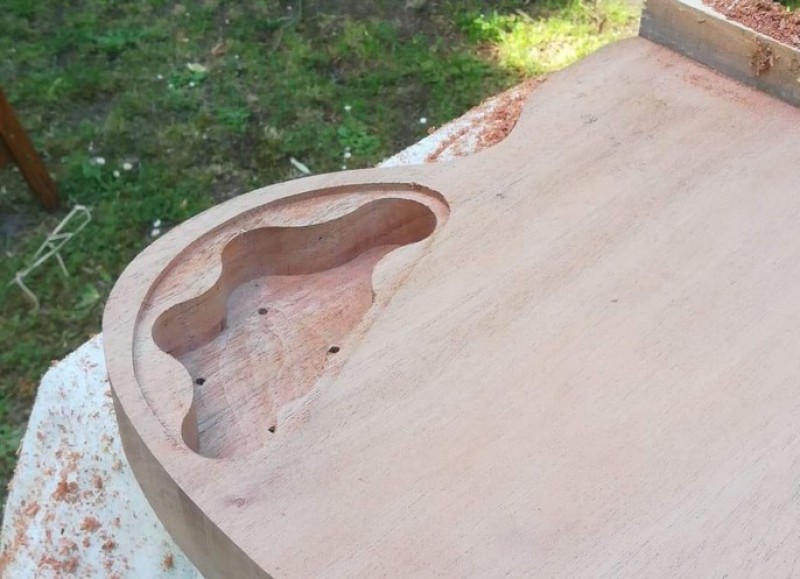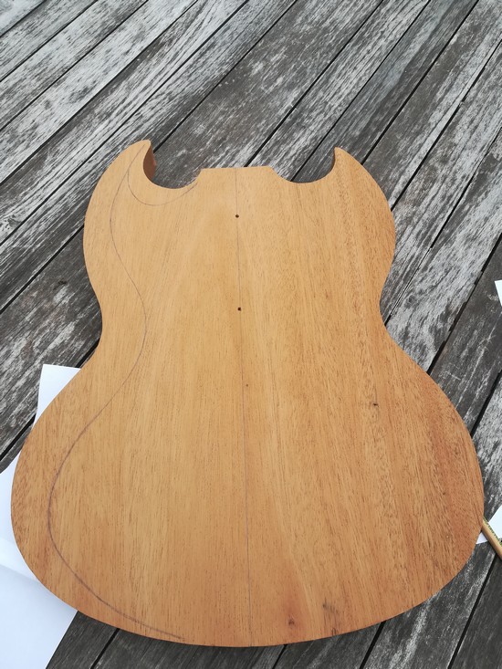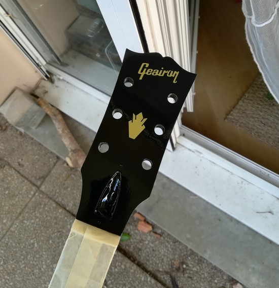 J'avais aussi foutu un plaquage de tête de 2mm, ce qui fait que la tête était beaucoup trop épaisse et les mécaniques sortaient à peine pour accueillir les cordes. J'avais donc poncé comme un gros gogo* le derrière pour enlever de la matière, et bien sur pas uniformément.