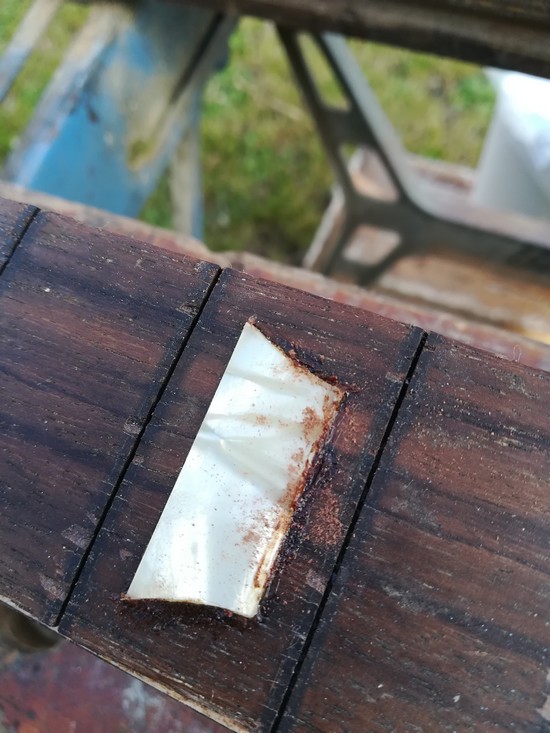 Je m'étais fait donc une joie de commander des inlays déjà teintés. De toute beauté. Cela ne sert malheureusement à rien puisqu'il faut absolument poncer la touche après et la couleur ne tient pas , ils redeviennent blanc. Il faut donc faire un travail de relicage plus tard.