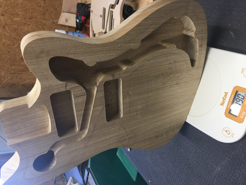 Elle aura une meilleure tête après le ponçage / polissage. Ca me rappelle qu'on a fait le même truc sur la guitare de ma stagiaire, qui est à peu près basée sur la même géométrie (même diapason 25.5", même micro, même électronique) -
