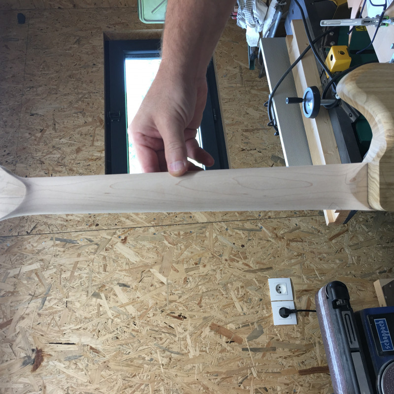 L'astuce consiste à utiliser un *petit* rabot pour ébaucher le rayon, en passes symétriques, parallèles à l'axe du manche. Cinq minutes à faire des petits copeaux, puis cinq minutes avec la cale à radius...