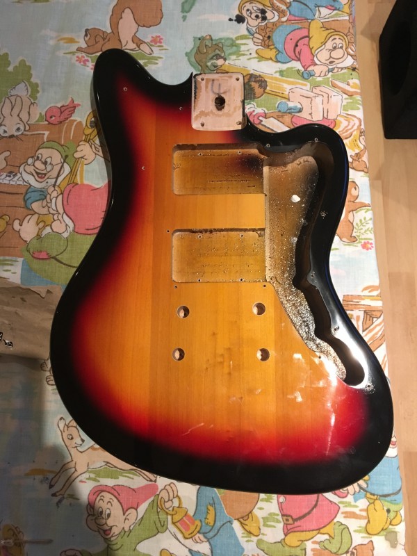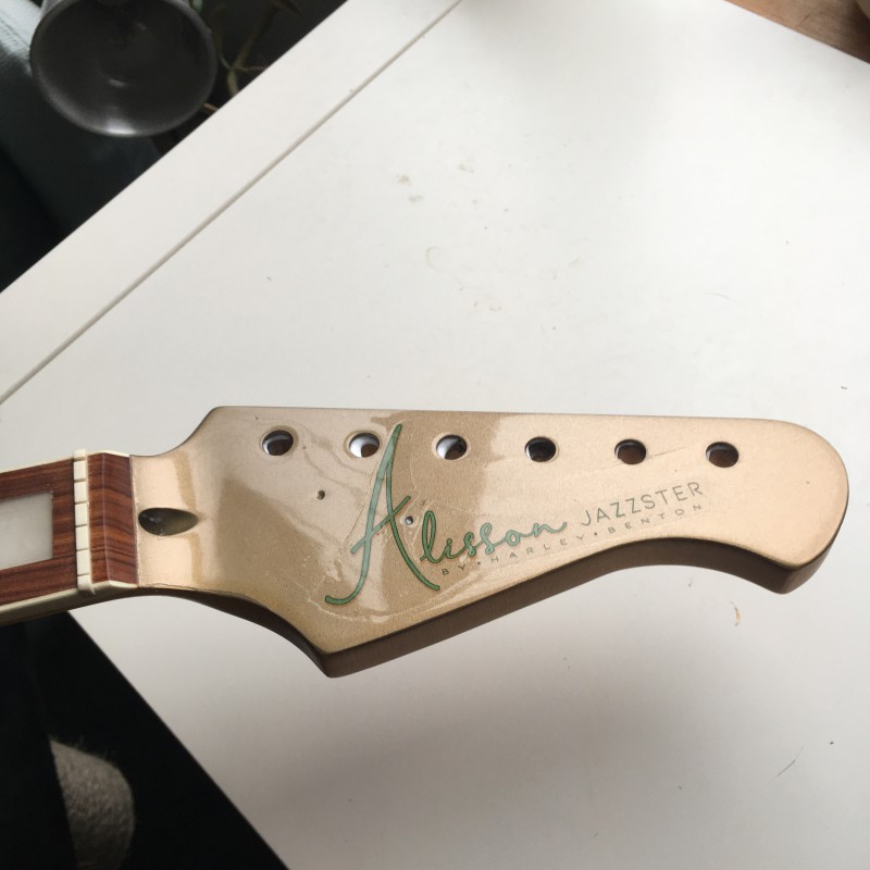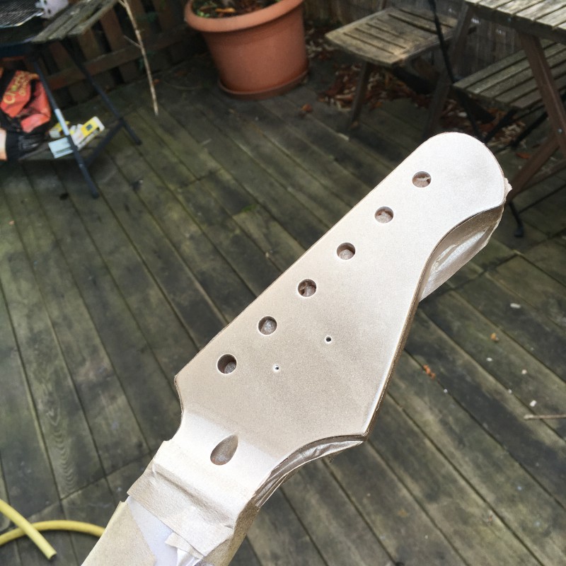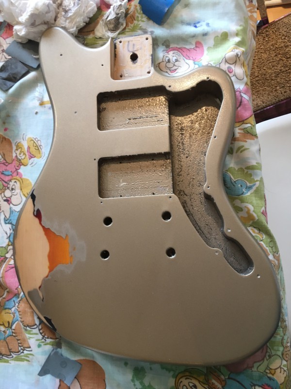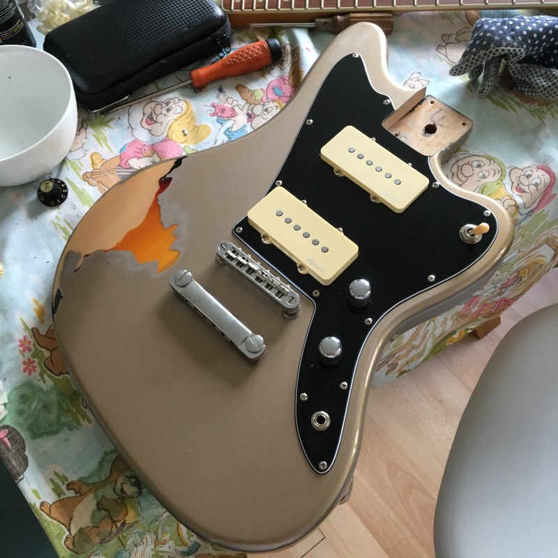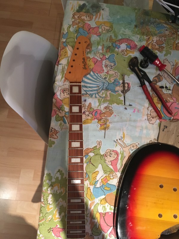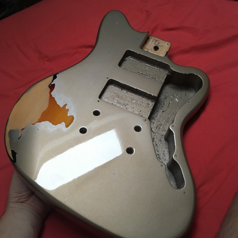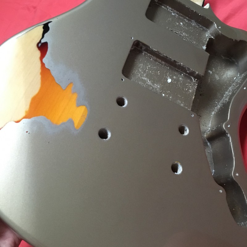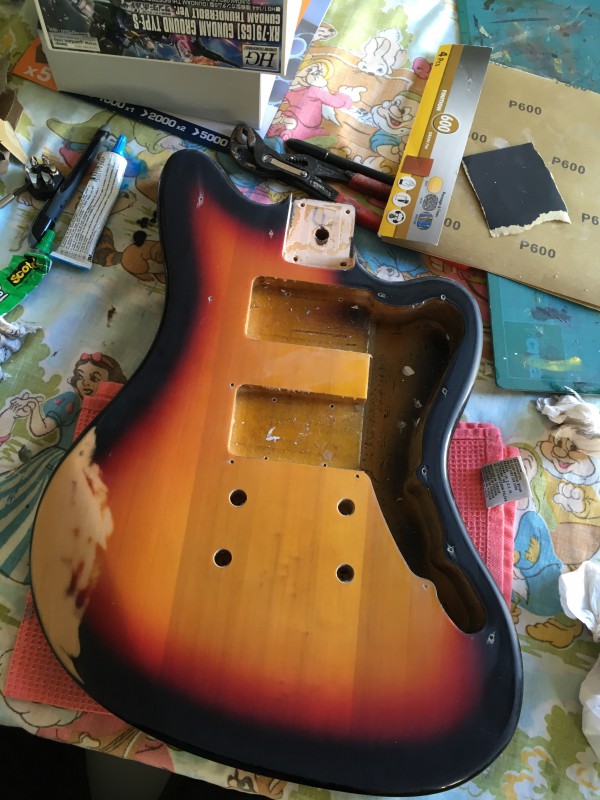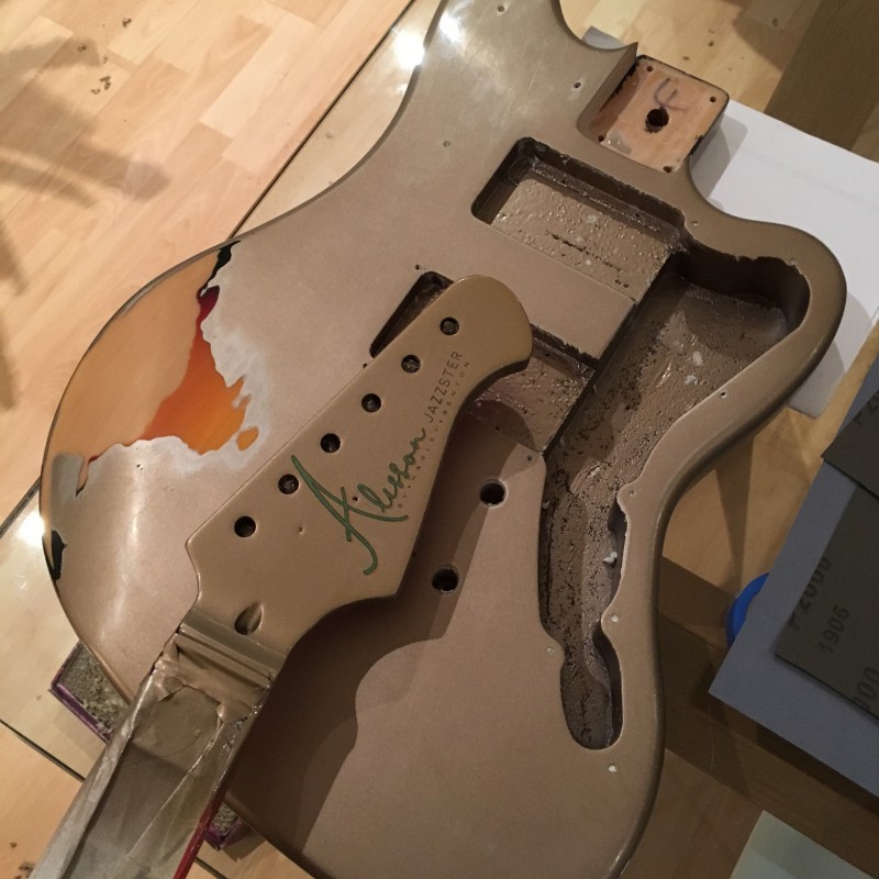 en gros pour ne pas être trop long, j'ai tout démonté et comme je garde le sunburst, j'ai juste poncé le corps et la tête avec du papier de verre 600, et bien sur, j'ai vérifié la compatibilité entre les vernis.