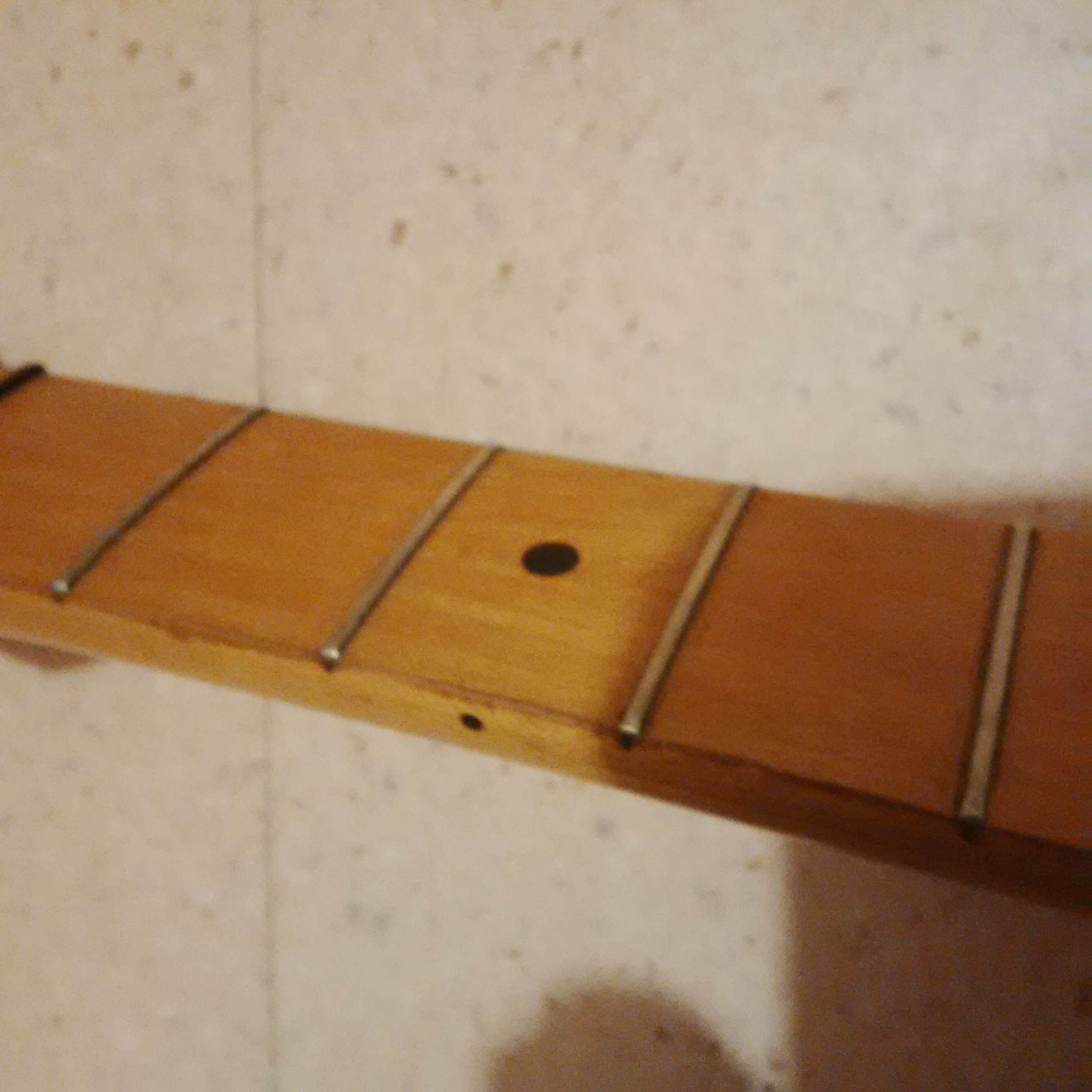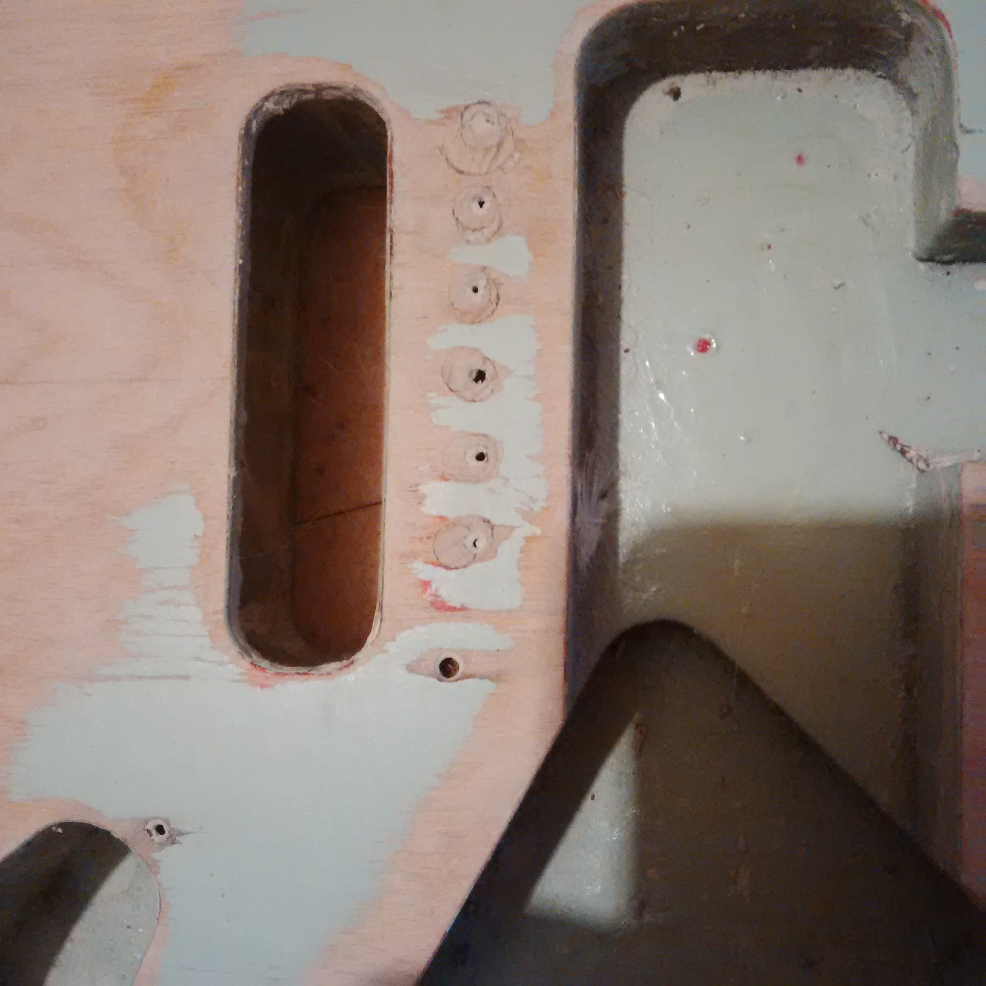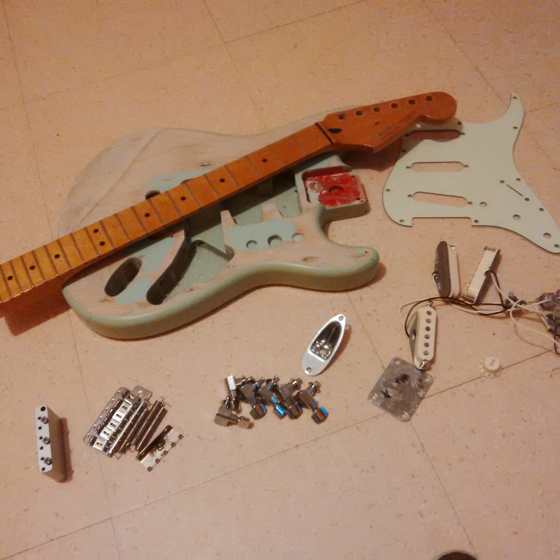 Après plusieurs tentatives de peinture et vernissage, j'ai décidé de tout redémonter car c'était moche (très). Et la guitare était injouable.Et me retrouvant sans guitare et un peu fauché, j'ai comme projet de tout reprendre à zéro (et de ne pas la peindre ce coup -ci).