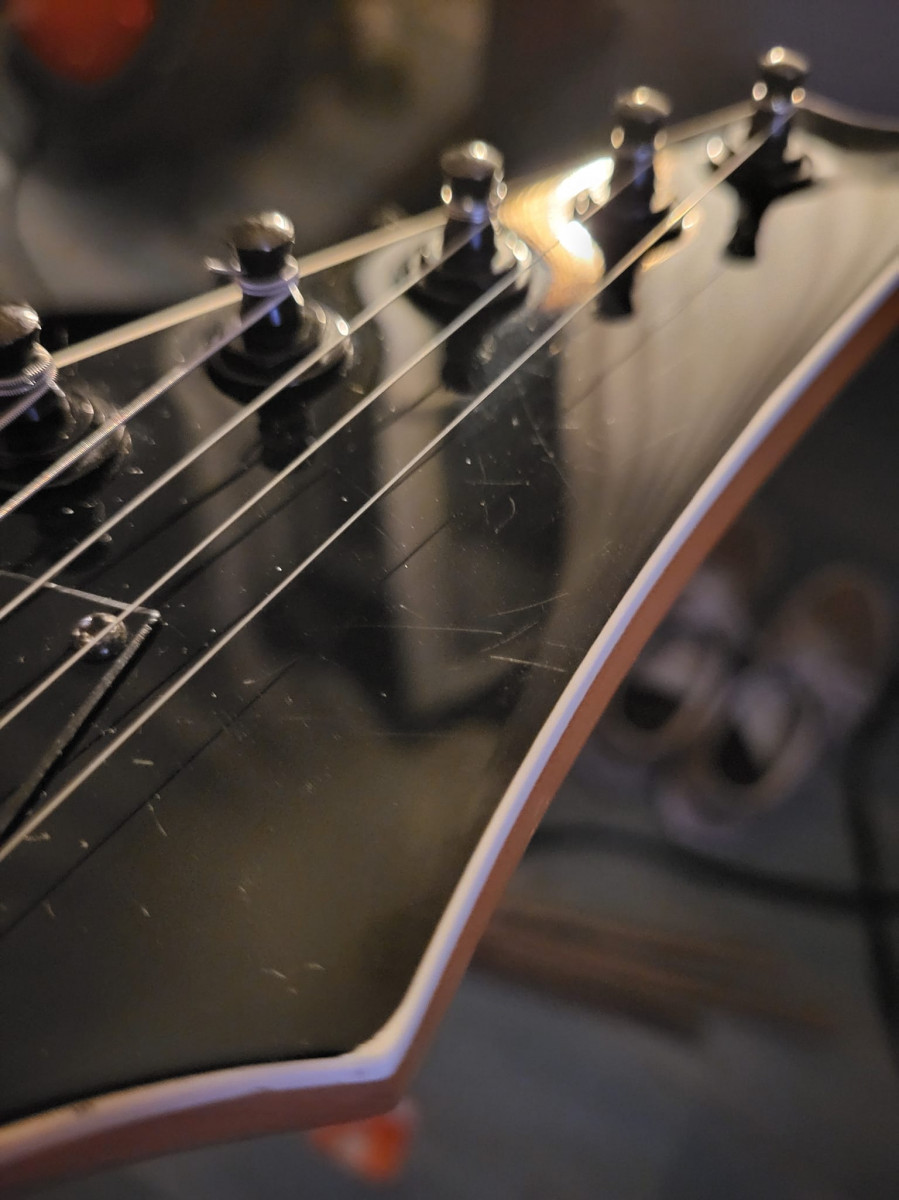 J'ai acheté la guitare telle quelle c'est à dire sans logo ... Le précèdent propriétaire avait "polishé" la guitare avec avec produit trop abrasif. Vu que le logo n'était pas vernis il est parti...