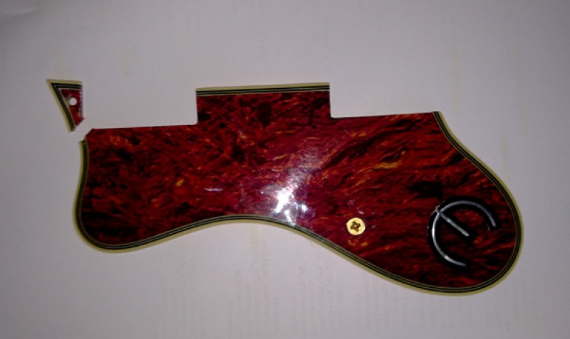 je suis depuis récemment l'heureux propriétaire d'une Epiphone Sheraton II (gaucher) dont le pickguard (tortoise) est cassé au plus mauvais endroit.