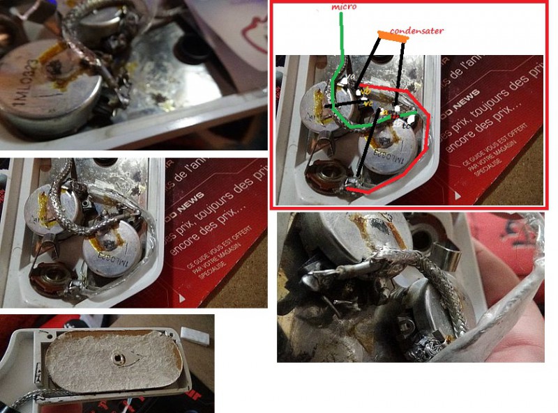Donc ca marche ainsi juste avec un fil électrique, sans le condensateur (même avec remarque) mais le second bouton ne change strictement rien au son, du coups je me demander si c’était normal ou si quelqu'un en ayant une pourrait me donner la bonne configuration et / ou me dire si c'est normal voir quelles pattes rejoindre.