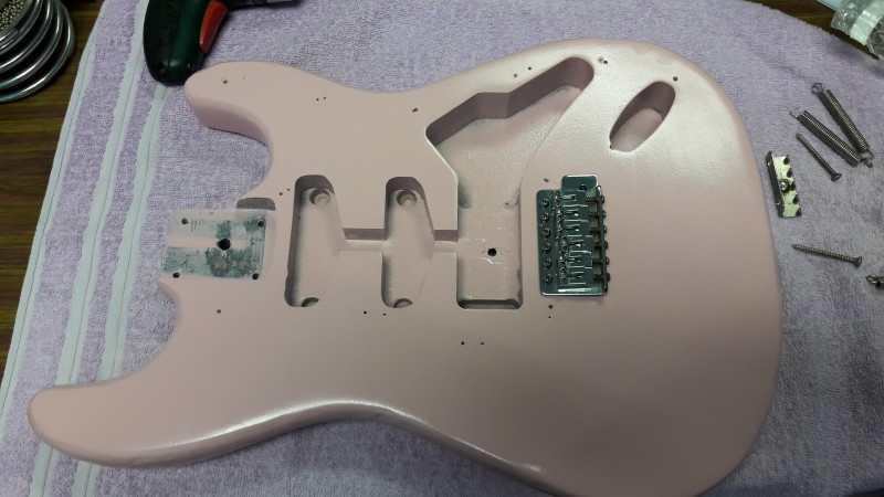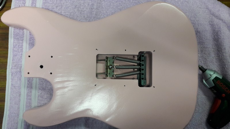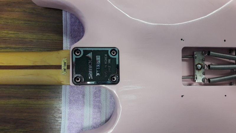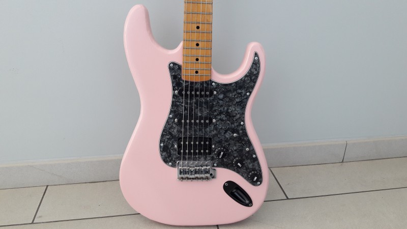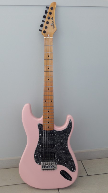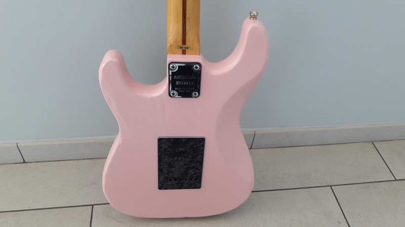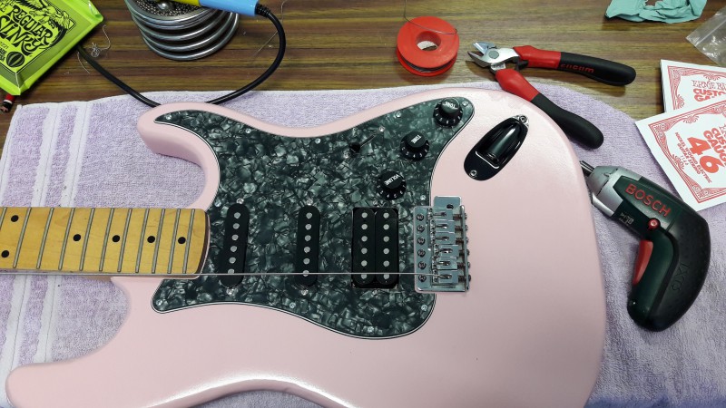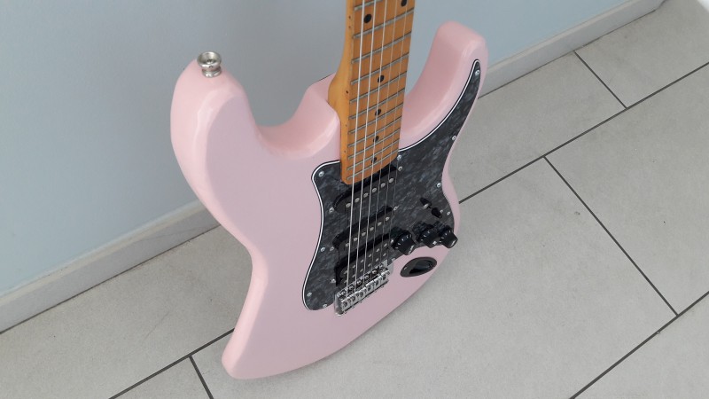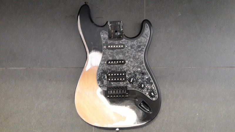 il l'avait montée avec un vibrato noir et un PG en HSS complet commandée sur aliexpress ( je l'ai découvert par la suite, oui s'en fout un peu..).