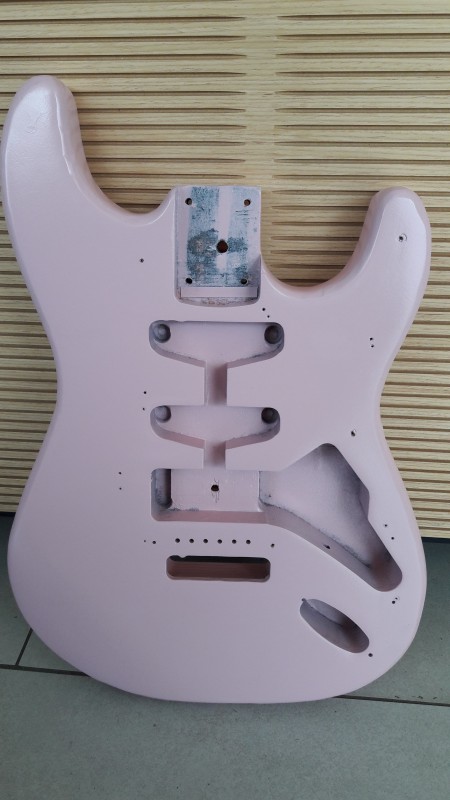 Bon comme dit plus haut, j'ai acheté une vieille Samick, repeinte par son ancien proprio ( je n'ai plus la photo complète, juste une tof en cours de poncage) en noir, ce qui vous le conviendrez est le summum du moche.