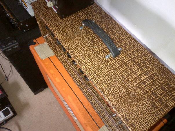 On habille le tout avec un beau (faux) tolex en vrai croco synthétique et voila!! j'hésitais avec de la moumoute rose, mais bon, le croco c'est quand même plus sobre!
