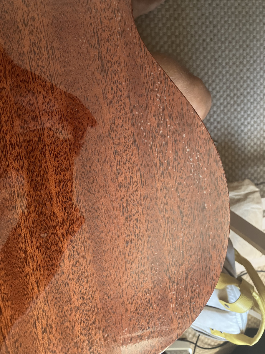 J'ai constaté avec stupeur que ma Lag HyVibe s'est recouverte pour partie de petites tâches grises qui semblent se trouver sous le vernis, et qui m'évoquent de l'humidité.