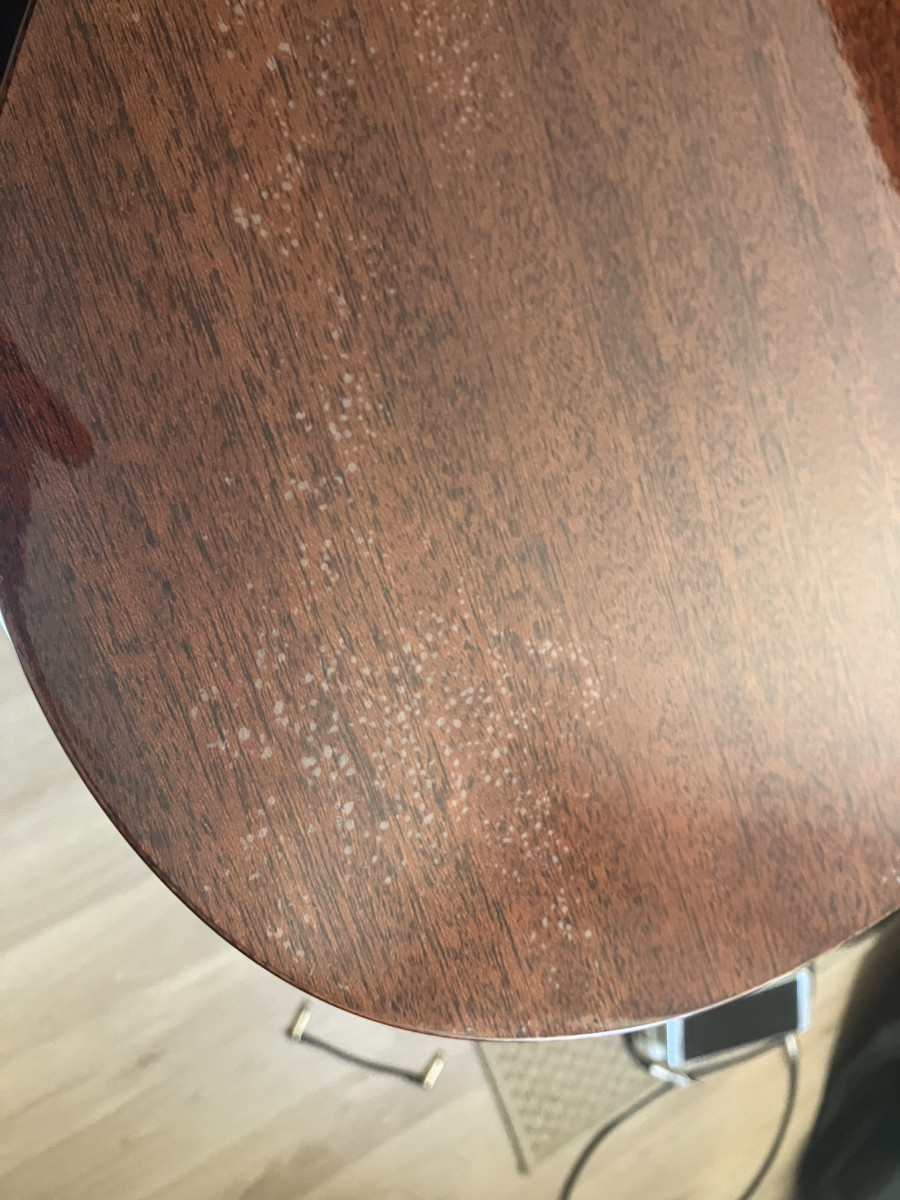 J'ai scruté l'intérieur de la caisse et je n'ai rien vu de particulier. La guitare est majoritairement restée chez moi, dans un environnement non humide. Une idée de ce que ça pourrait être, et de comment traiter ça ?
