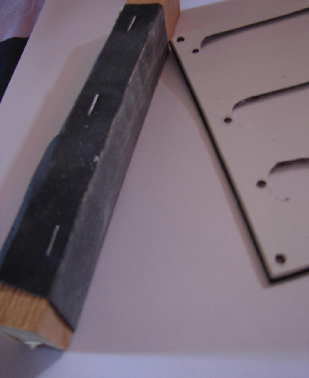 Histoire d'éviter d'acheter sur internet un pickguard à l'aveuglette et se rendre compte que les trous ne sont pas au bon endroit et tout et tout, je me demandais si c'était pas plus simple de tailler dans le pickguard de ma Telecaster Deluxe (mex) pour la faire ressemble à une Custom (et monter un simple bobinage en chevalet pour que ça claque !)