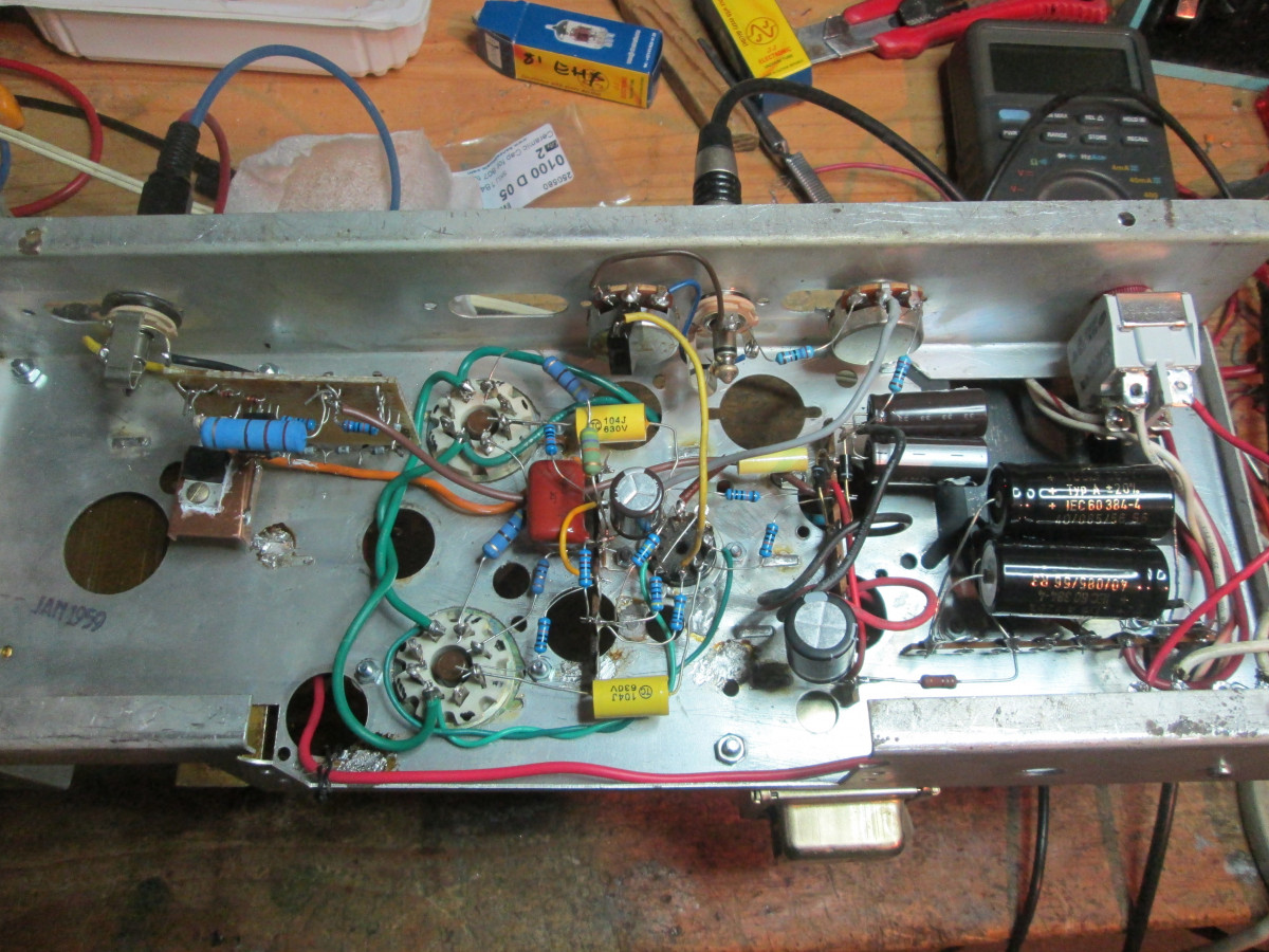Pour l'instant, je maquette les différents modules. Le Dumbleator serait à base d'ECC82, pas besoin de beaucoup de gain en retour d'effet. J'en ai quelques unes (Philips, Mazda etc...) en stock et ça me permet d'économiser mes ECC83.