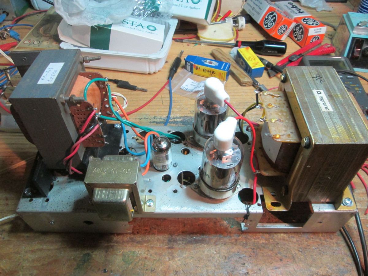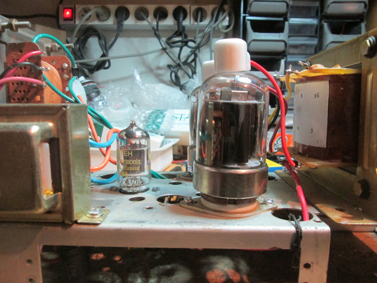 Aux premiers essais, j’obtiens 30W sinus, compte tenu que le transfo d'alim est très sous-dimensionné et que, donc, la THT s'écroule dès qu'on tire de la puissance ! Mais c'est encourageant ! La tension aux G2 reste bien constante. Pas de surchauffe anomale et, malgré le montage à l'arrache, pas d'instabilité ou de bruits bizarres ! Même la ronflette est absente !