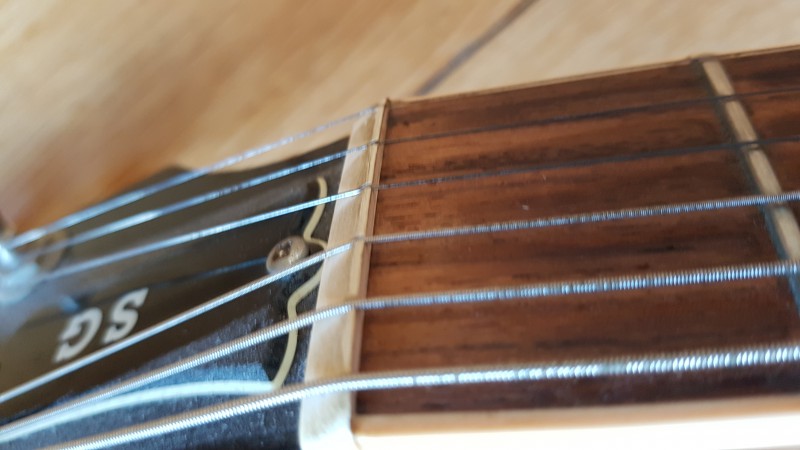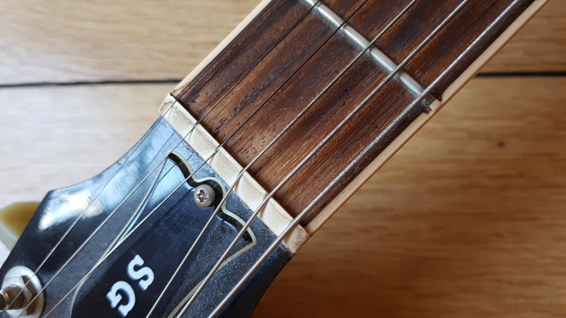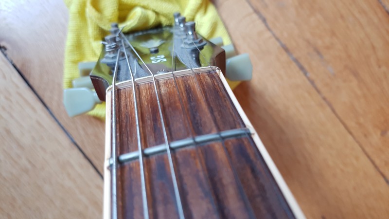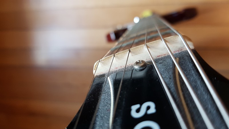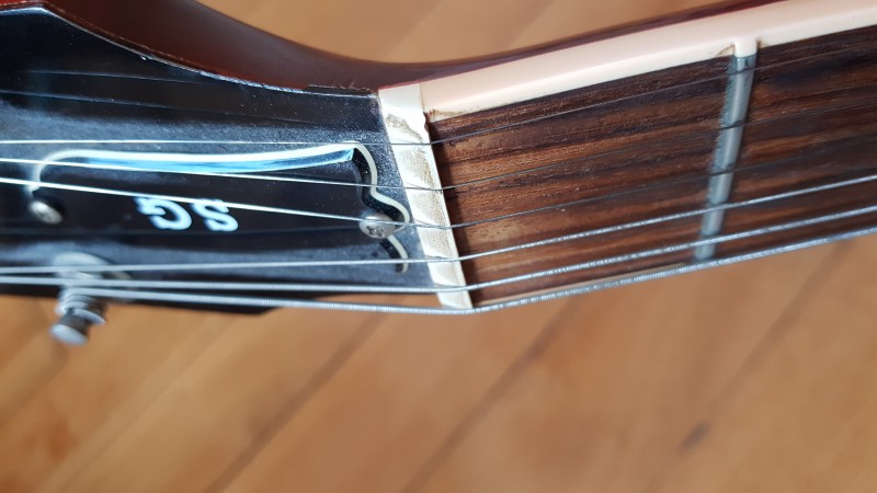 En revanche je suis comme toi très dubitatif sur le sillet qui est d'origine (on voit bien la continuité du vernis comme tu l'évoque) et pourtant me semble très mal taillé. On voit bien sur les photos (la dernière notamment) que la corde de mi grave rentre peu dans le sillet. Par contre, j'ai l'impression qu'il y a très peu de marge entre le fond des gorges et la touche (visible sur la troisième photo). C'est-à-dire que si je devais corriger les choses, je verrais plus les gorges devenir plus profondes pour mieux maintenir les cordes, mais pas en les creusant et en rapprochant les cordes de la touche. Ça me conduit à penser qu'il faudrait carrément changer le sillet.
