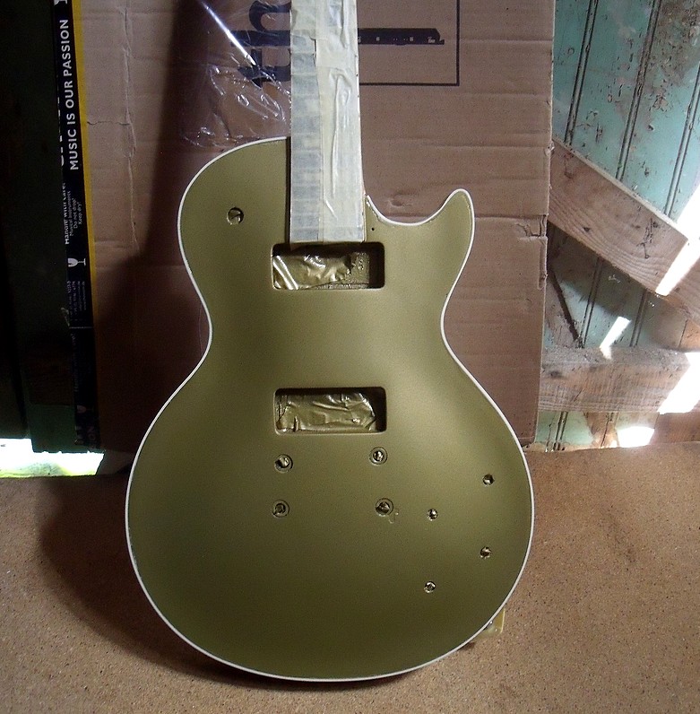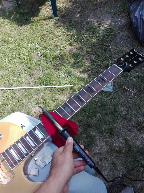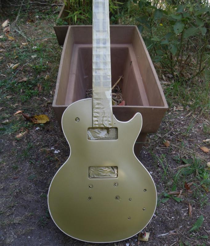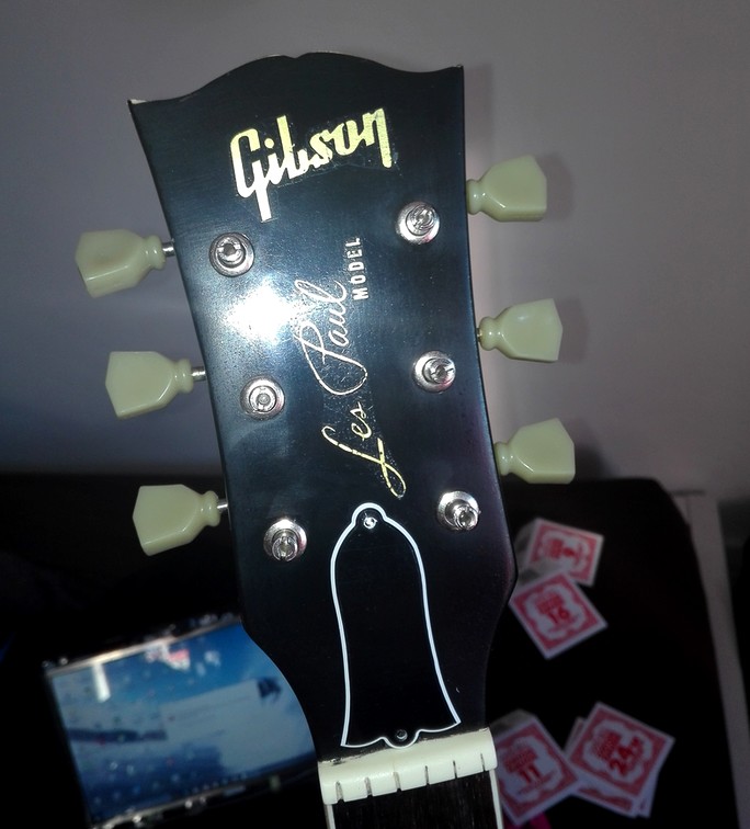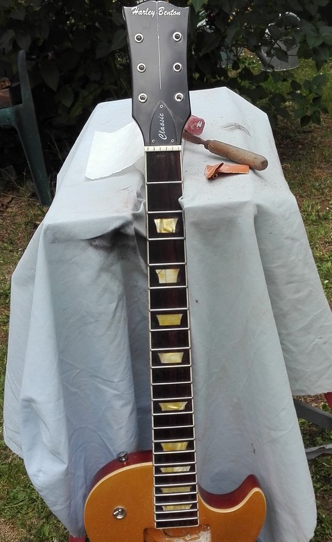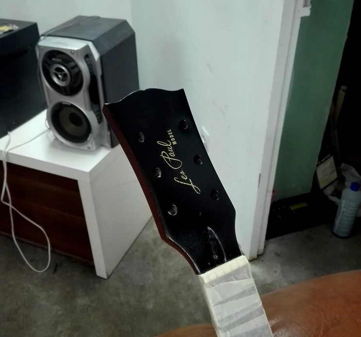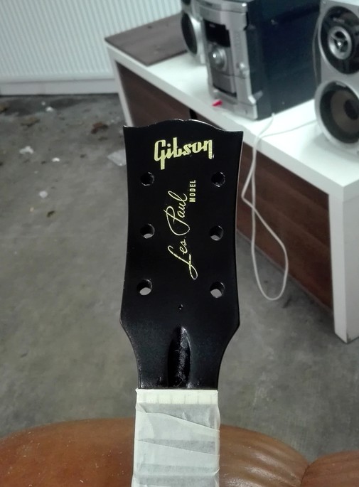 Ici rien de plus simple il suffit de tailler juste le haut de la tête façon Gibson, puis de poncer pour faire accrocher la peinture , peindre en noir , vernis , poncer , revenir et polir , puis poser les autocollants.