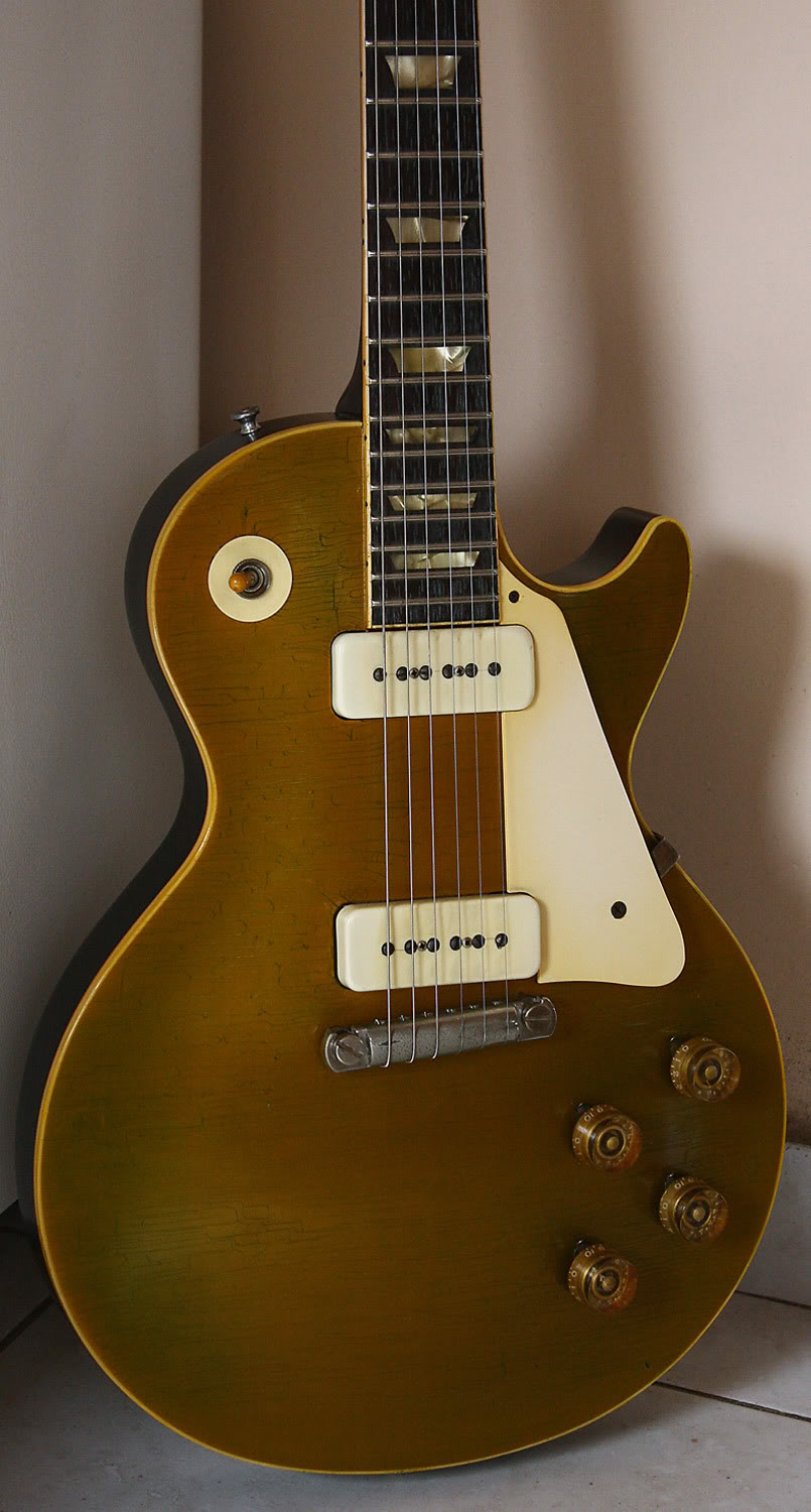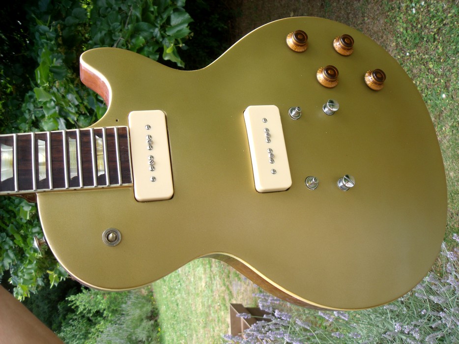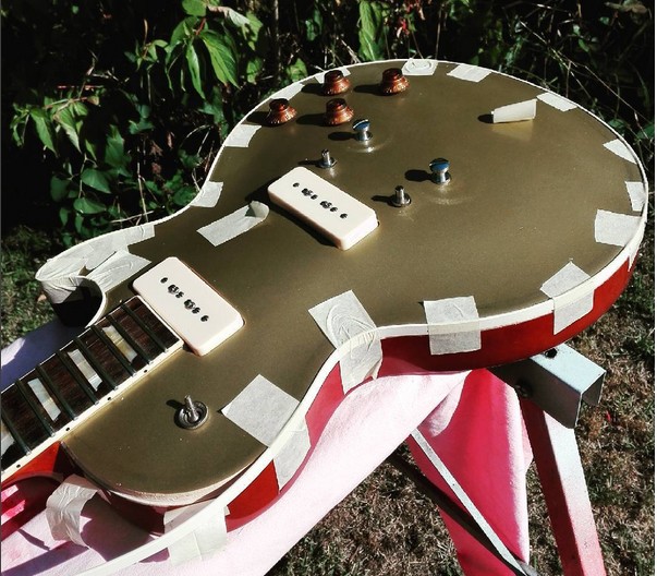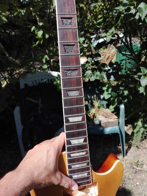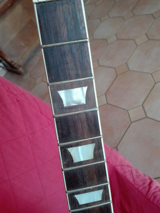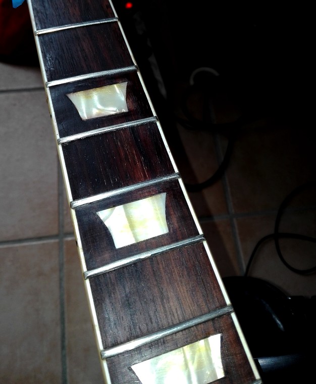 Ici rien de plus simple il suffit de tailler juste le haut de la tête façon Gibson, puis de poncer pour faire accrocher la peinture , peindre en noir , vernis , poncer , revenir et polir , puis poser les autocollants.