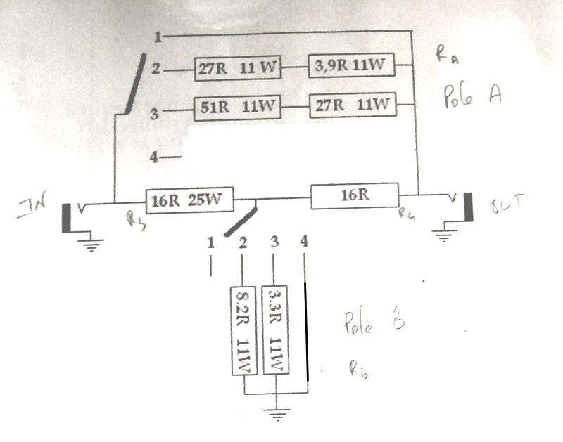 Je te donnerai mes valeurs de résistances plus tard, mais déjà je peu te dire que j'ai fait un -12 -18 -24db + bypass en 16 Ohms. Donc si tu ne veux pas les même atténuations ou que n'est pas en 16 Ohms les valeurs ne te serviront à rien.
