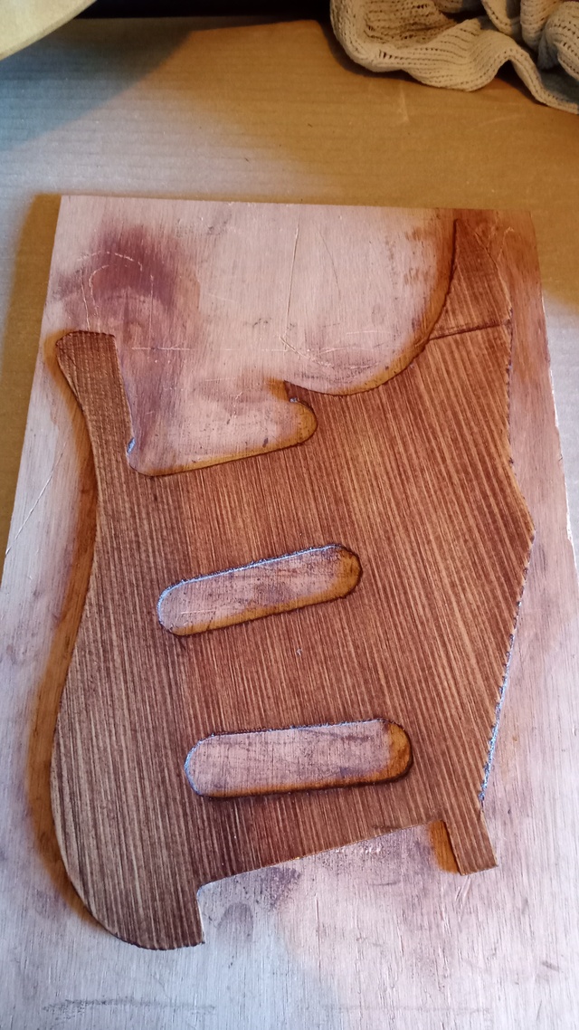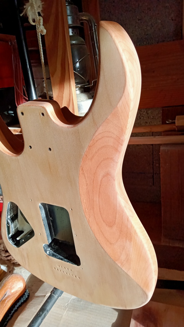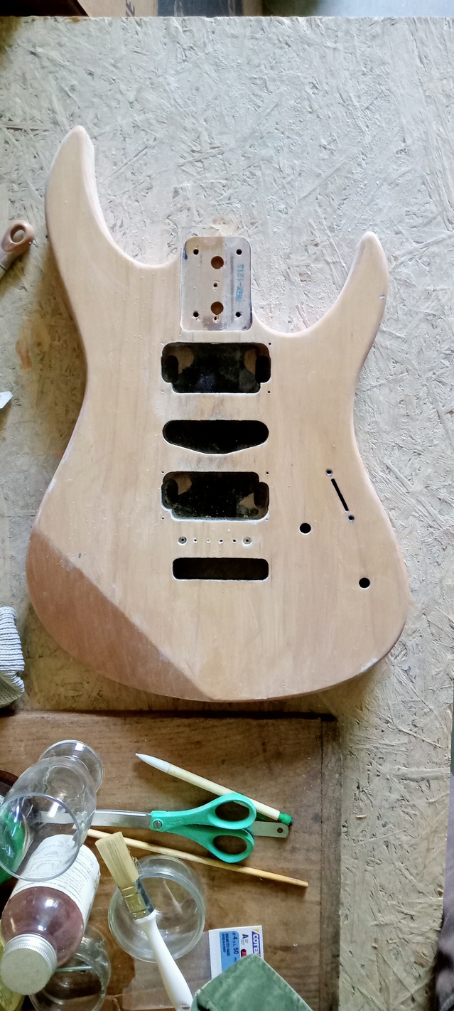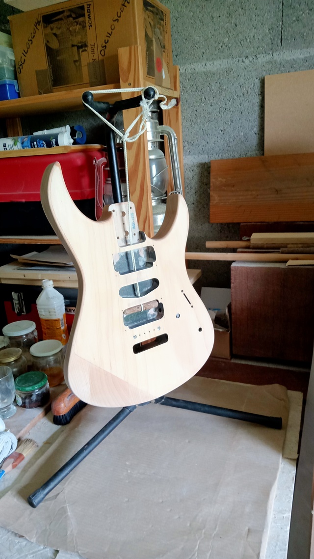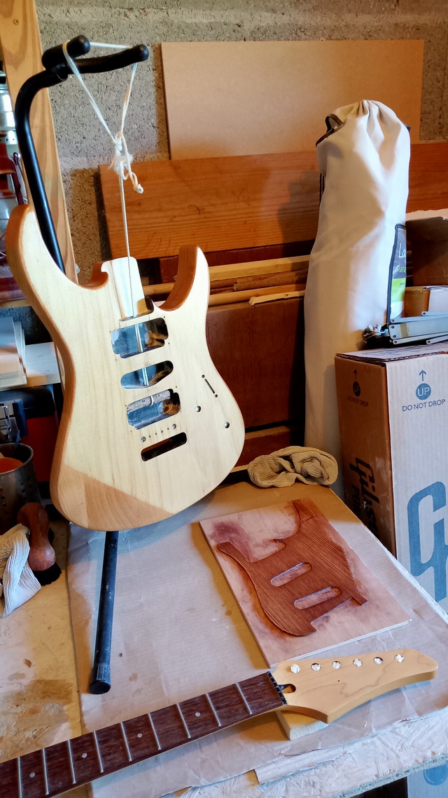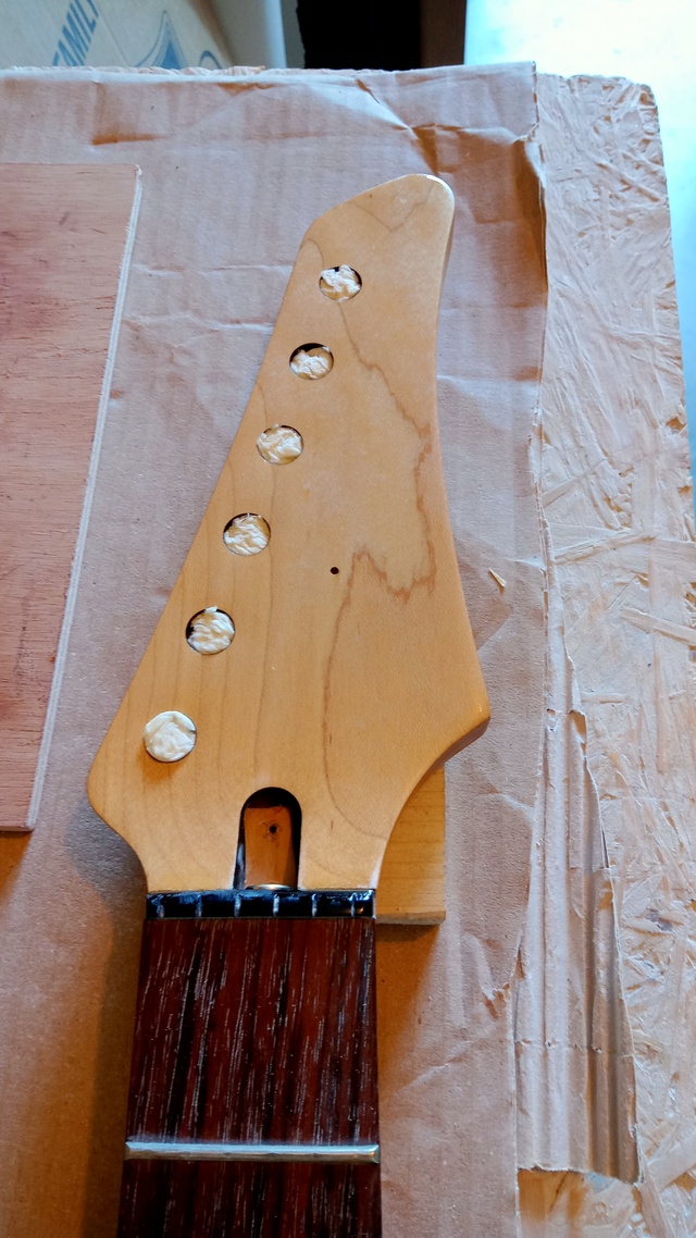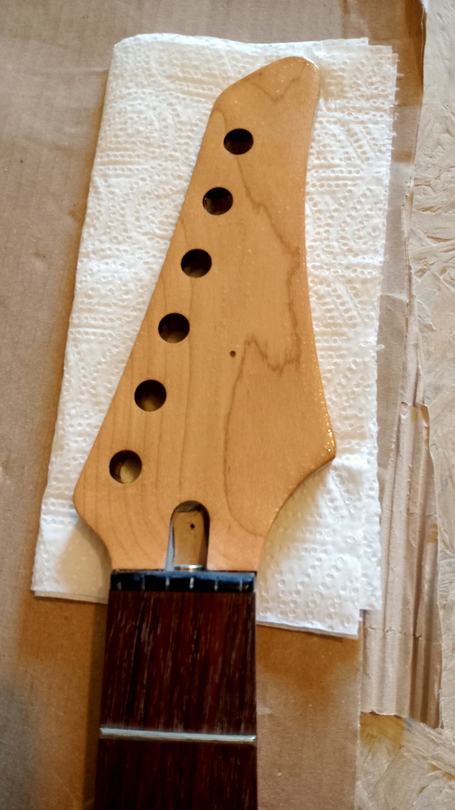 L'érable de la tête du manche boit nettement moins le vernis que les autres éléments - épicéa, peuplier, aulne - ce qui largement justifie les deux couches de fond dur que j'ai appliquées précédemment. Au point où je me demande si ça vaut vraiment le coup que je fasse une seconde couche sans couleur sur la tête. J'aviserai lorsque ça sera sec.