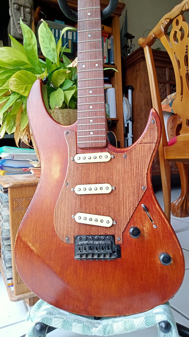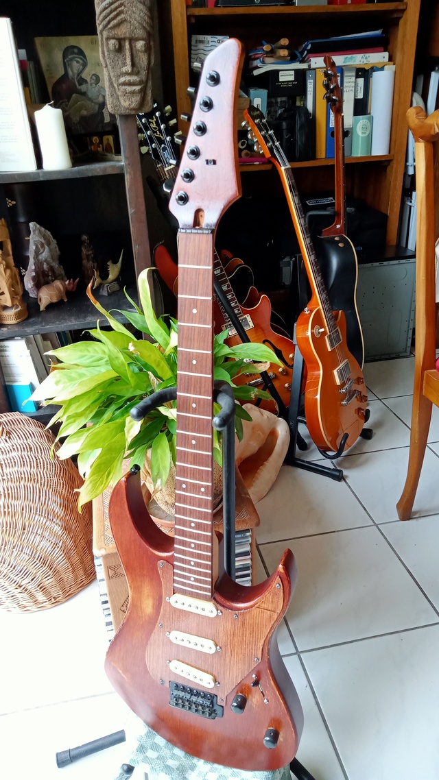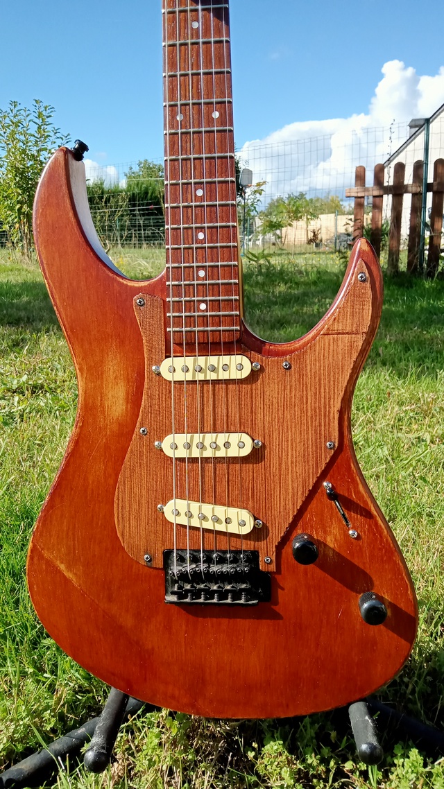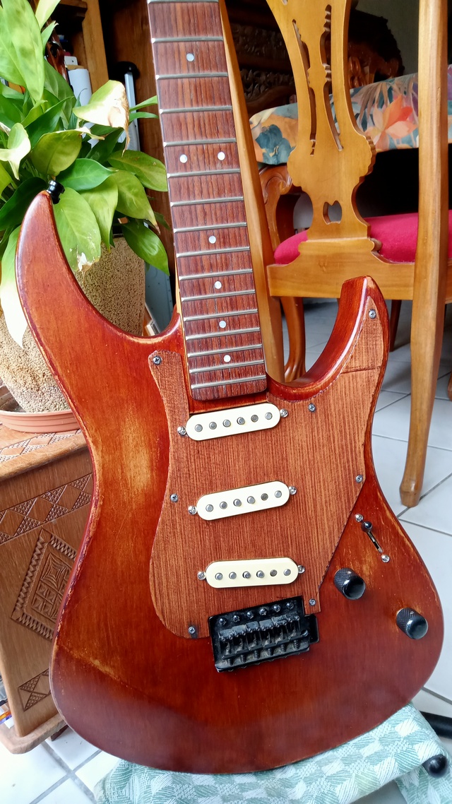 Presque sept mois de patience qui en valaient la peine. Je me trouve avec une guitare plutôt légère - pas repesée depuis mais elle faisait dans les 3,5Kg d'origine - très confortable et agréable à jouer pour moi, au look unique, personnel et très inspirant à mes yeux et qui de plus est sonne vraiment bien comme je l'avais pressenti lors de mes essaie à vide dans son jus d'origine. L'accastillage d'origine est correcte, le vibrato se comporte bien une fois correctement réglé, en tous cas c'est mon premier ressenti. Elle a l'air de tenir l'accord, à voir à l'usage à long terme mais le gros test de l'après-midi me conforte dans ce sens. La lutherie résonne bien, ça se sentait lors des différentes opérations et encore mieux une fois dévernie, mais aussi au jeu une fois recordée. Ca vibre bien et on le ressent bien physiquement. Résultat des courses, pour environs 300€ au total, je me retrouve avec une Stratocaster que je trouve toute aussi bien que mes trois autres Stratocasters avec juste un look différent et une personnalité sonore un peu différente aussi. Les micros de la série Pure Vintage (ici la version 61') ne m'ont pas déçu. Ils sonnent tout aussi bien que les 59' que j'ai installé sur une autre de mes Stratocasters avec la couleur attendue. Une réussite cette série semble-t-il en tous cas je les conseille. En quelques mots, je suis très content du résultat !