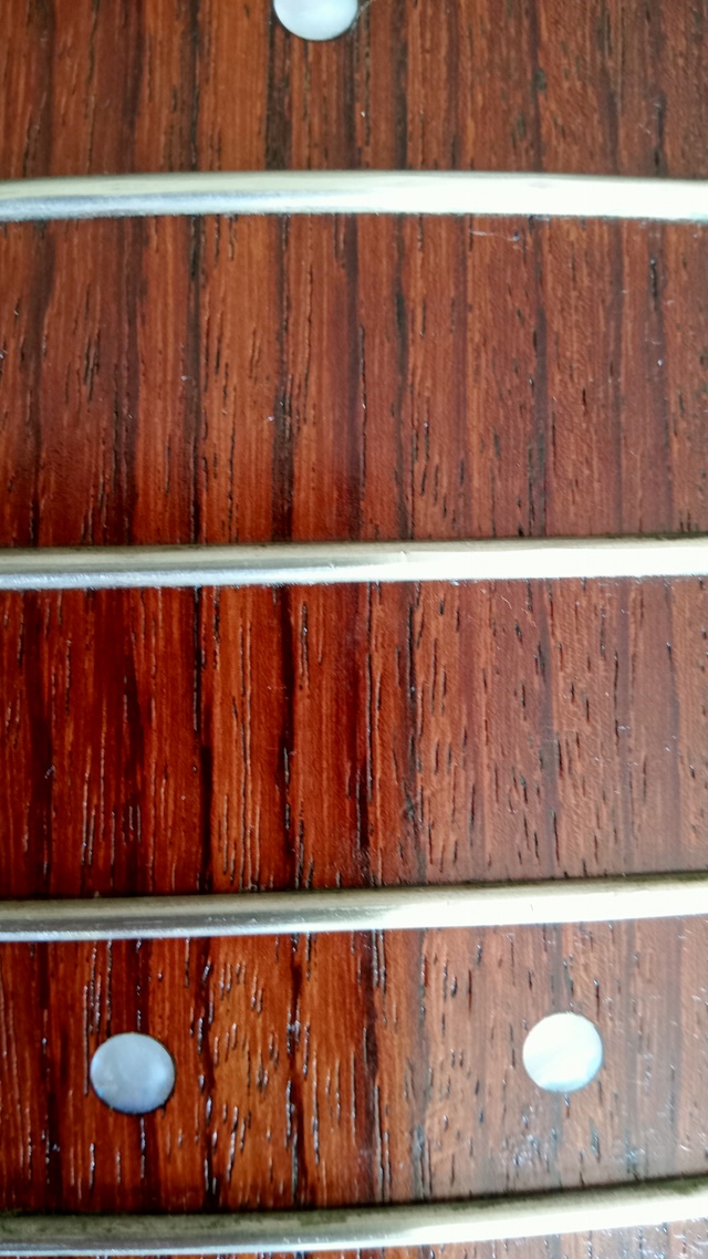 J'en ai profité pour m'occuper des frettes, aligner le manche etc ... monté un jeu de cordes D'addario EXL115 pour moi, peaufiner le sillet de tête, réglé la courbure, l'action et l'intonation.
