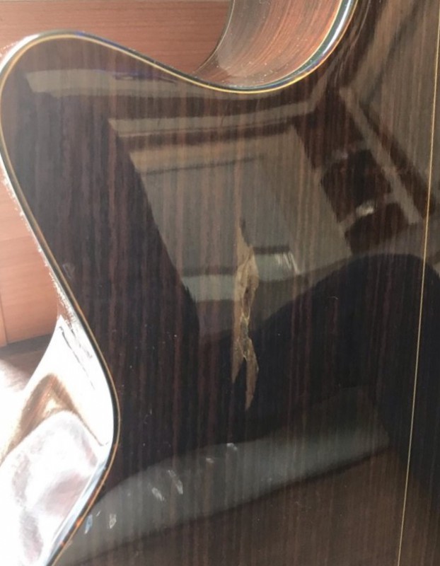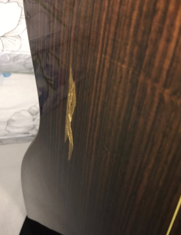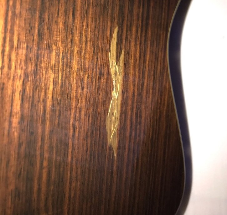 J'ai vu une guitare d'occasion qui a reçu un coup visiblement important au niveau du dos.