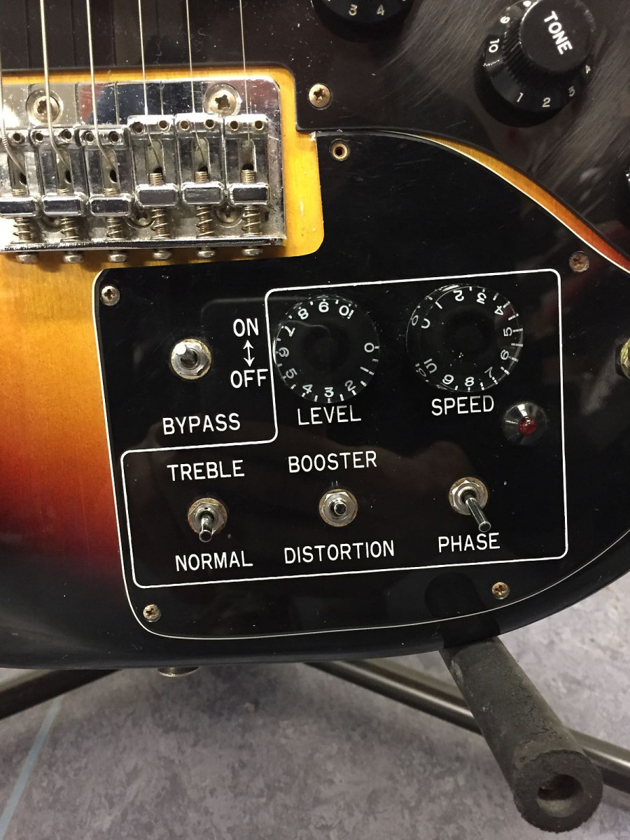 il l'avait acheté en 1976 et l'as usée jusqu'a ce qu'elle soit injouable. Des crevasses dans le manche, plus rien ne tenait dans l'electronique, et du coup il l'a laisser vieillir en deco sur un mur, car c'est un des objets qu'il affectionne le plus.