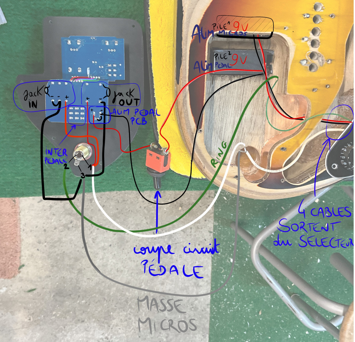 Au cas ou il nous seraient impossible de reproduire les effets d'origine j'ai eu comme idee de consolation d'y integrer une pedale d'effet fuzz ou disto à la place.