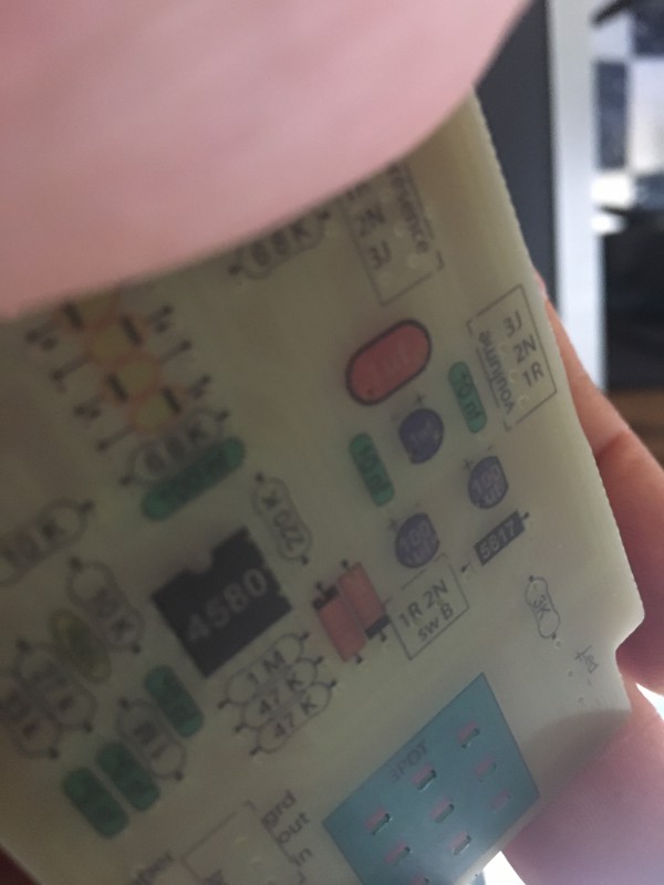 Le fait que un des côtés du PCB soit imprimé avec l’image des composants est vraiment un plus. Je pense que cela évite pas mal d’erreurs de placement. Pour ce qui est du côté à souder sur le PCB cette "gravure à l’anglaise" est vraiment très efficace dans le sens où la soudure est contenue par les pastilles. je suis pas sûre d’être très clair mais en gros cela fait comme des lignes d’arrêt qui vont contenir l'étain en fusion.