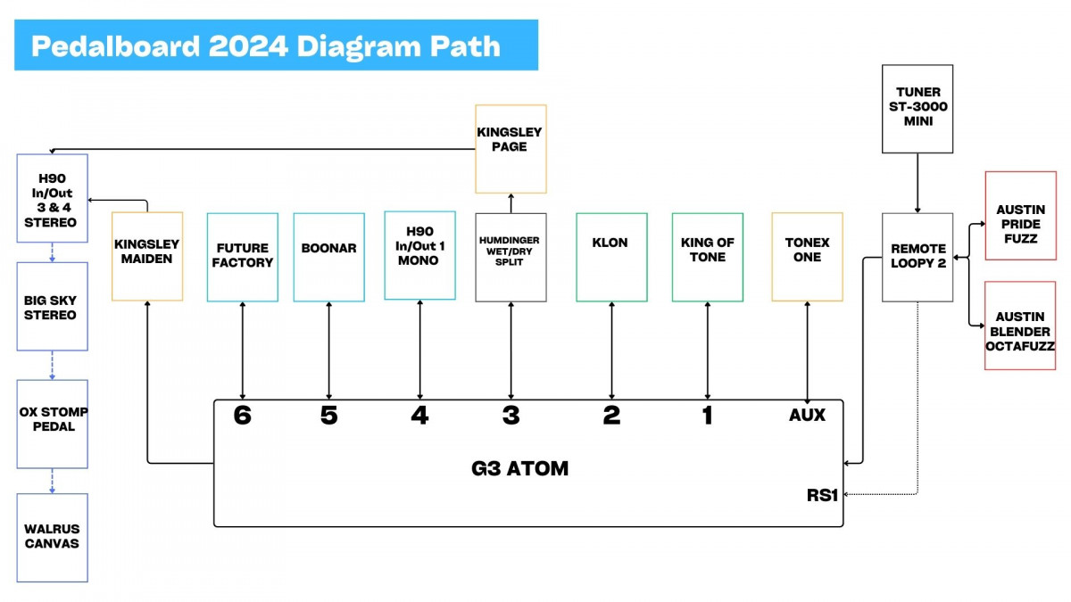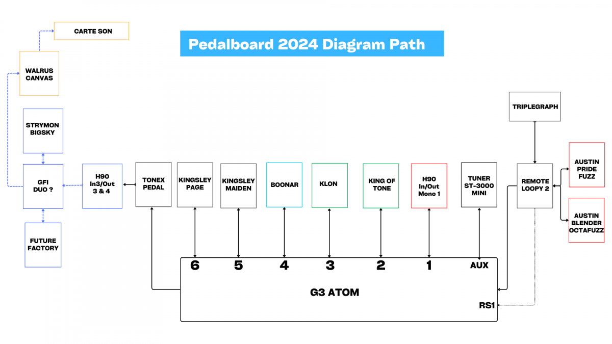 Le noyau principal de mon son c'est Fuzz, OctaFuzz, KOT, Klon, Boonar et Eventide