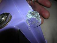 C'est un peu la merde si je peux dire (je peux ?), puisque un, ça ne tient plus le capot du tout, deux, je ne peux pas mettre une autre vis puisque le trou est parfaitement bouché, trois, la vis a bien sûr cassé pile de façon à ce qu'il n'en dépasse pas assez pour la choper avec une pince. Brouf.