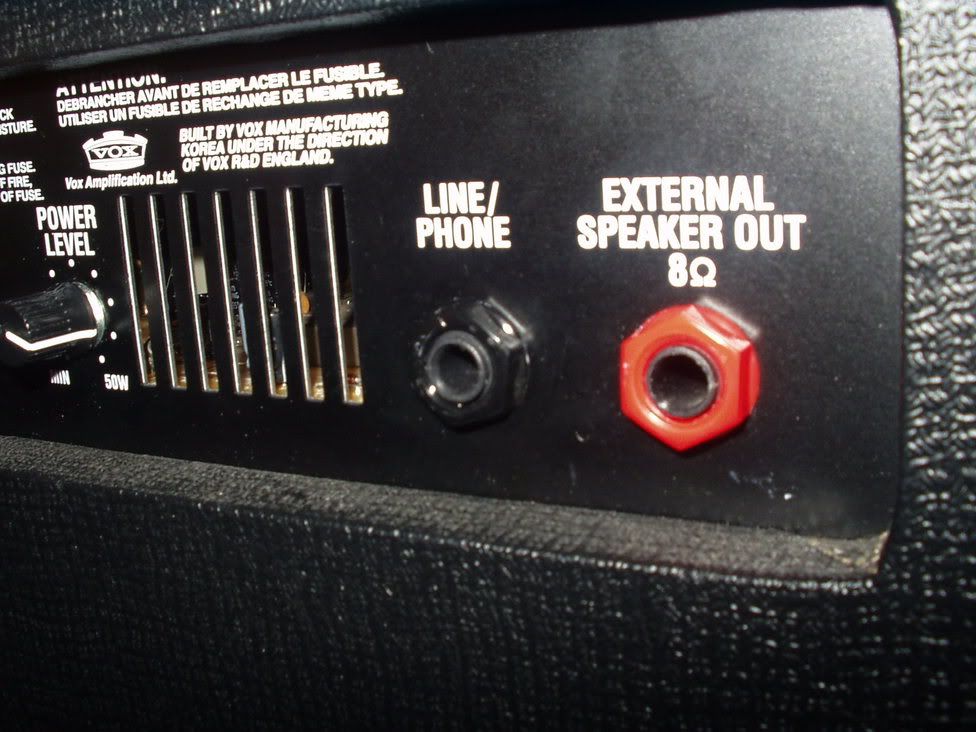 Une autre solution serait de sortire un signal ligne de ton Vox (line/phone) vers le poweramp in du Marshall. Dans ce cas la il faut allumer les deux amplis, Le vox sera utilisé en entier (preampli, ampli, enceinte) et le Marshall uniquement depuis l'ampli de puissance. Le son sera donc a regler sur le preampli du Vox, le seul controle qui fonctionnera sur le Marshall sera son master volume (vu que tu rentre apres le preampli, le gain d'entrée et l'EQ ne seront pas fonctionels.).