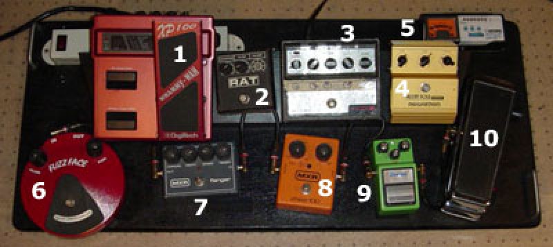 1. Digitech XP 100 Whammy Wah 2. Rat Distortion Pedal 3. ADA Flanger from 70s 4. Rocktron Austin Gold Distortion 5. Boss TU-12 Tuner 6. Original Fuzzface! 7. MXR Flanger 8. MXR Phase 100 9. Ibanez TS-9 Tube Screamer 10. Dunlop Crybaby 535