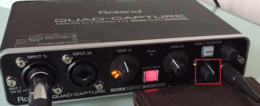 Le potard PLAYBACK / INPUT je le mettais tout à droite, ou au milieu, comme conseillé par le vendeur, car il me disait "sinon tu auras un son pas terrible". Alors j'ai été con et discipliné, je l'ai laissé comme il a dit. Idem pour le bouton MONO (éteint sur la photo).