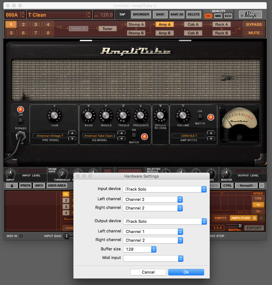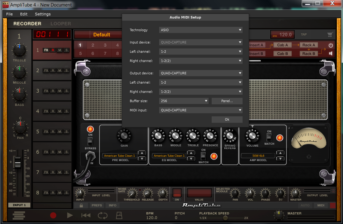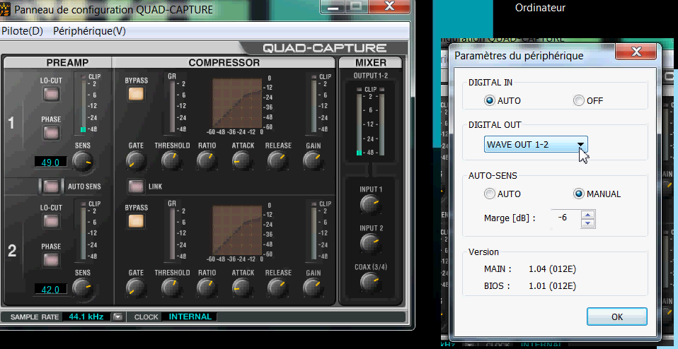 Maintenant, sans rien touché aux réglages audio, je mets le bouton MONO en ON (sur la carte son); le bouton playback je l'amène un peu vers la gauche et ça roule. J'ai quand même miséré un peu car j'avais le son de la carte + amplitube, donc en gros quand je mettais un AMP crunch, je me retrouvais avec le son clean de la carte par dessus, super dégeulasse le son...