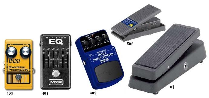 de gauche à droite; DOd 250 overdrive & preamp/ MXR eq/ behringer(