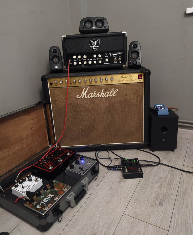 Ça faisait un moment qu'à la maison je jouais avec la bête branchée dans l'ampli uniquement, n'ayant pas d'enceinte, et ma chaîne étant à l'opposé, et soudain me vint l'illumination : mon 5.1 PC qui traine à la cave depuis facilement 5 ans!