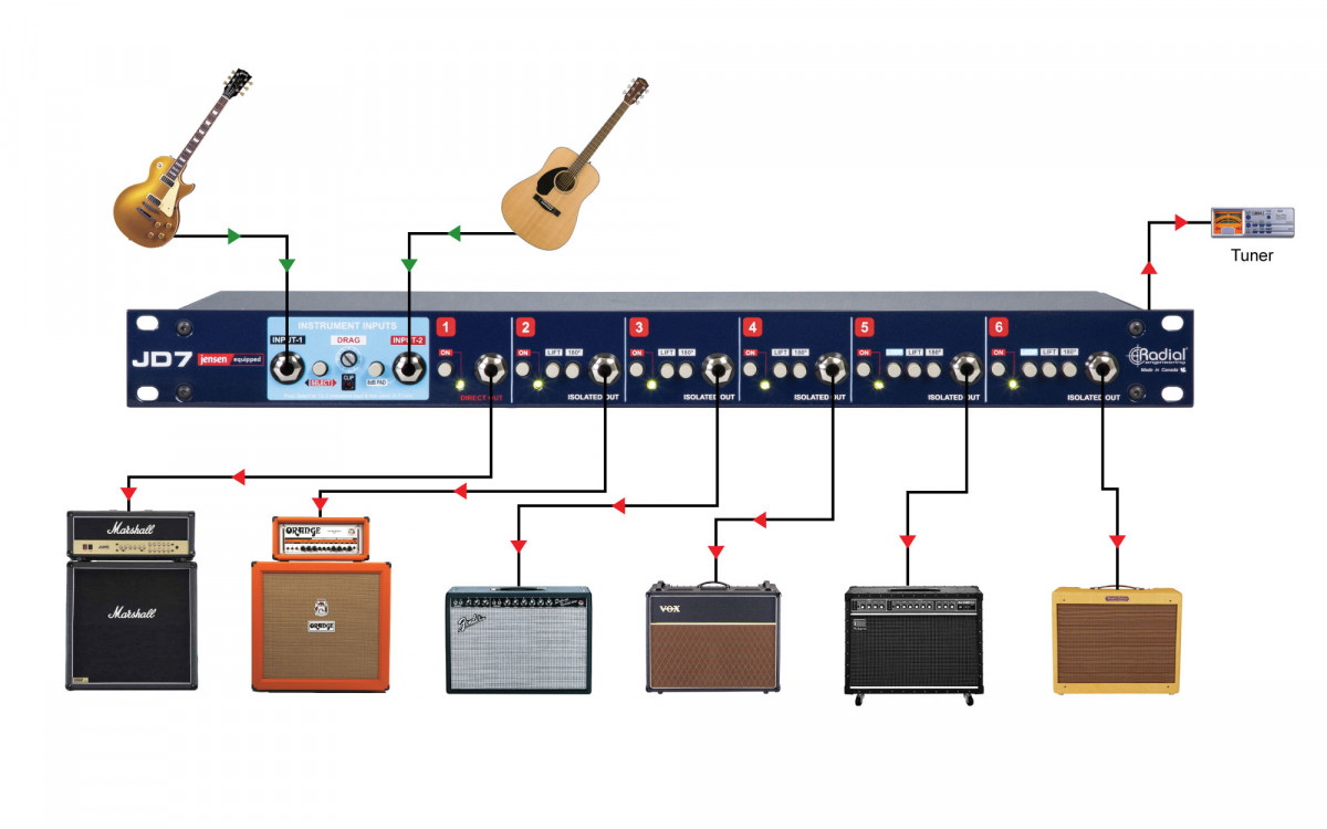 Existe-t-il un equivalent du Radial JD7 (trop cher) ? J'aimerai un truc en rack qui me permette d ebrancher ma guitare et de router le signal vers differents ampli/preampli sans avoir a tout debrancher/brancher. je voudrais brancher entre 3 (je me contenterai dejà de ça) et 7 sorties(ideal)