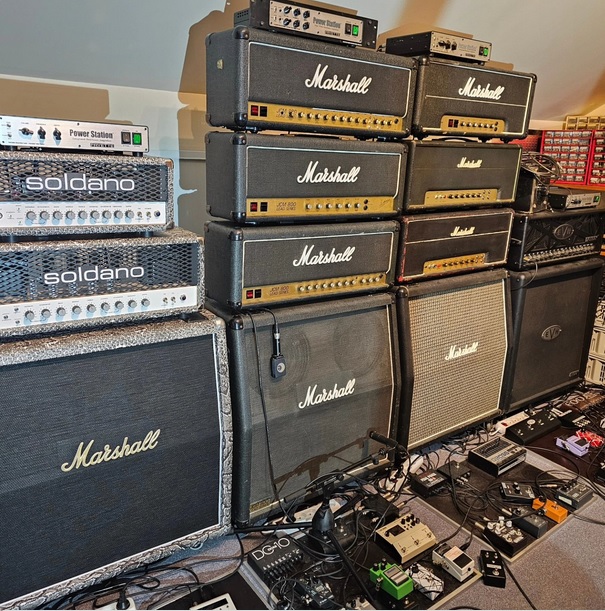 Le 3ième baffle sur le mur date de 1976 avec 3 HP Greenback G12M d'origine et un plus récent. Ce stack est pour le son EVH "vintage" avec des Marshall specs 1968 sur variac. Pourtant j'ai l'impression que le JCM800 sonnait un peu mieux avec...mais chaque vieux Marshall a un son un peu différent, donc c'est difficile de dire si ça vient du baffle ou de l'ampli.
