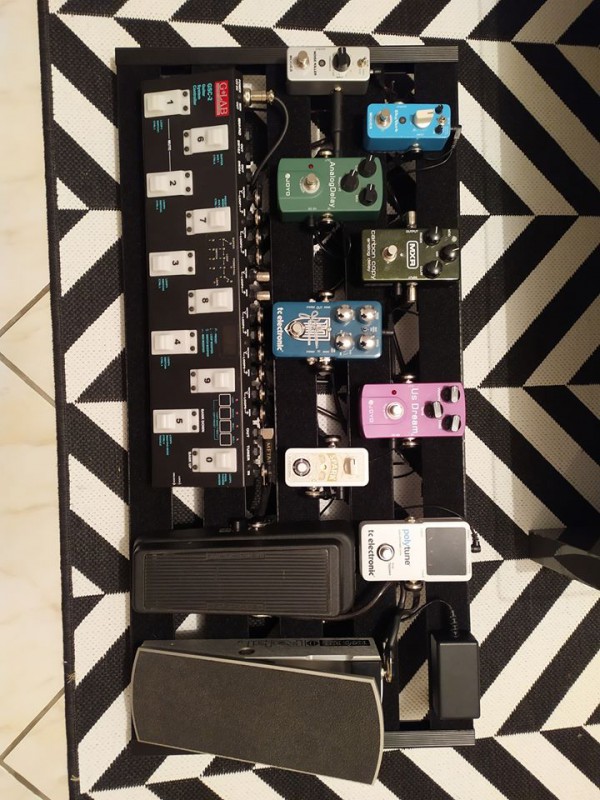 Volume --> wha --> boost --> Disto --> phaser / flanger --> delay 1 --> Delay 2 --> reverb --> noise gate