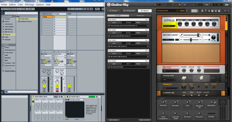 Par contre je n'arrive pas à passer de mon Preset son saturé (cf capture : "Orange pressé") à un son clair !!! Sur la tête d'ampli orange il y a une liste déroulante qui me permet de passer à un réglage de son clair (de passer à une autre preset) Or, cette liste déroulante ne peux pas être assignée à une macro :/ Ce que je peux faire sur Guitar rig, avec Rig Kontrol 3, mais pas avec Ableton.