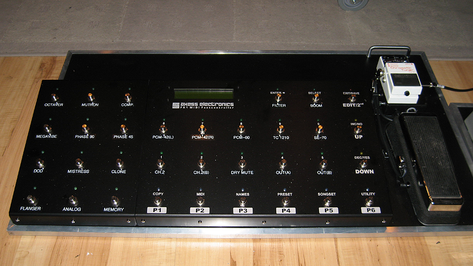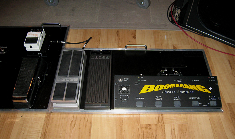 On the floor is the king of all midi controllers-the Axess FX-1 with expander, Boss TU-2 and a vintage King Vox wah. Thanks to Mario for making such a great unit. The second board has a Boss FV-500 H, Boss FV-300L and a Boomerang. There is a dry mute and switchable outputs for the two amps. There is a wet volume and a pre volume.
