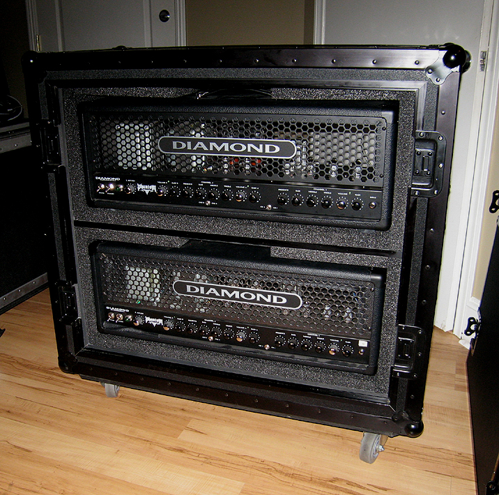 A Diamond Phantom head feeds two dry cabs in the center. The HH V800 feeds two wet cabs on the left and two on the right. Six cabs total-all with Vintage 30's.