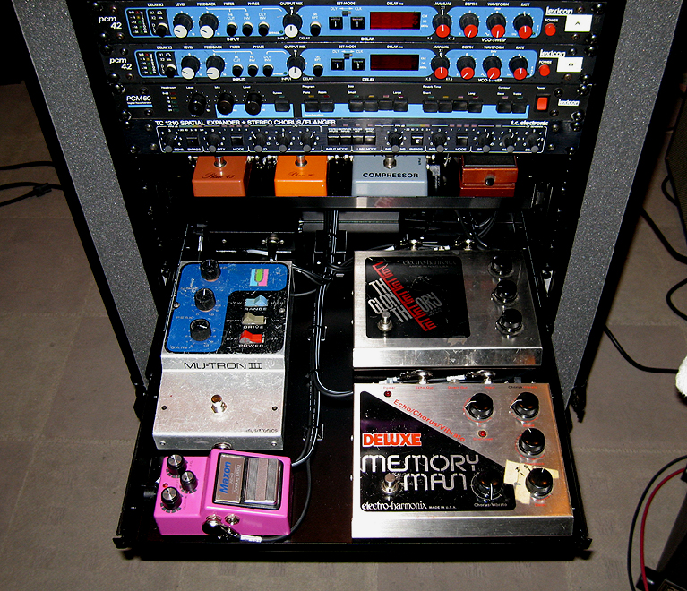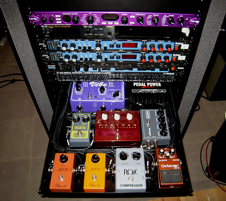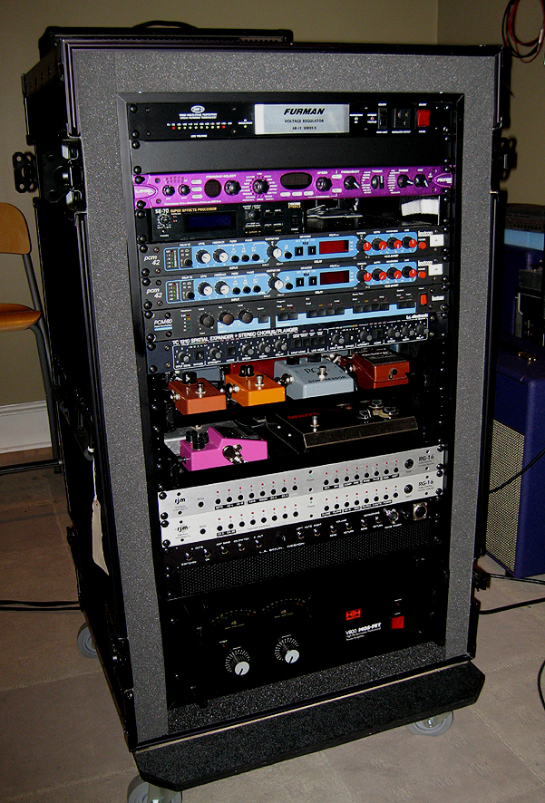 The rack pieces are as follows: Two PCM 42's, PCM 60, TC 1210, Line 6 Filter Pro, Boss SE-70, two RJM RG-16, L.A.S.D. interface.