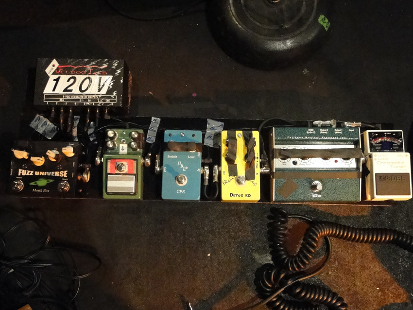 Enfin, j'imagine que le signal de sa guitare doit être splitté mais impossible de savoir quelle A/B/Y box il utilise.