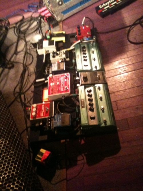 je vois 2 line 6 DL4, une fulltone OCD (j'aurai pas dit ça en écoutant ^^), un xotic EP booster, un EHX freeze, 2 EHX POG, 2 boss pitchshifter (tout en double décidément), un accordeur boss et une EHX holy grail.