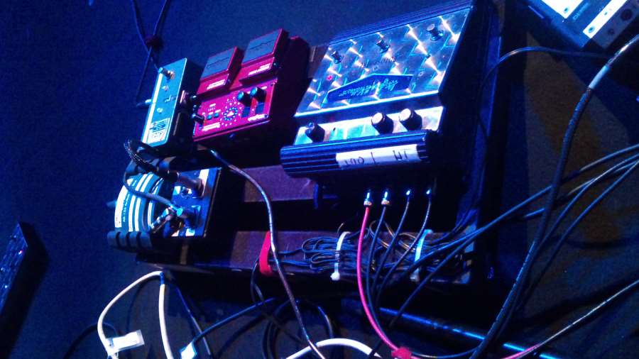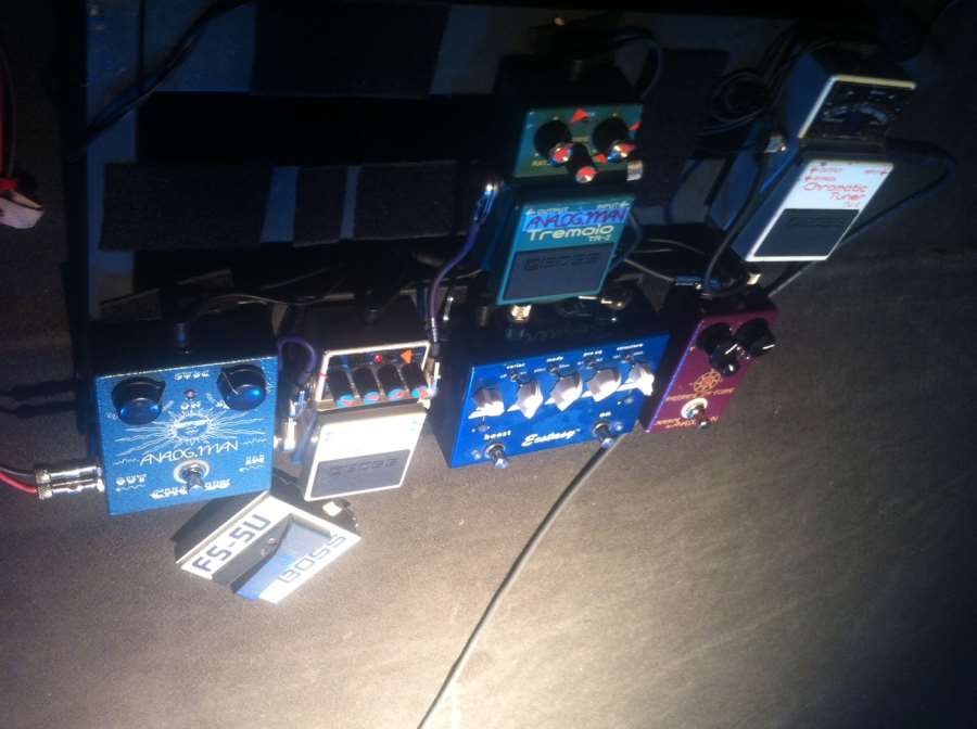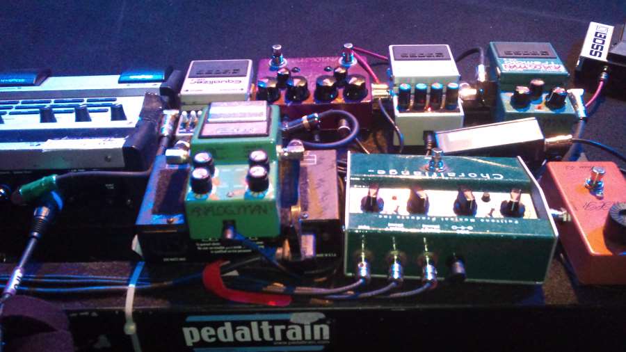 Celle qui est en train d'être branchée est décrite comme une "pédale turque". A droite sur la photo, ça ressemble fort à l'Echo-Puss de Way Huge et en haut de l'image, si c'est une Way Huge aussi (ça y ressemble), c'est soit l'Aqua Puss, soit la Havalina (trop claire pour être la Saucy Box)