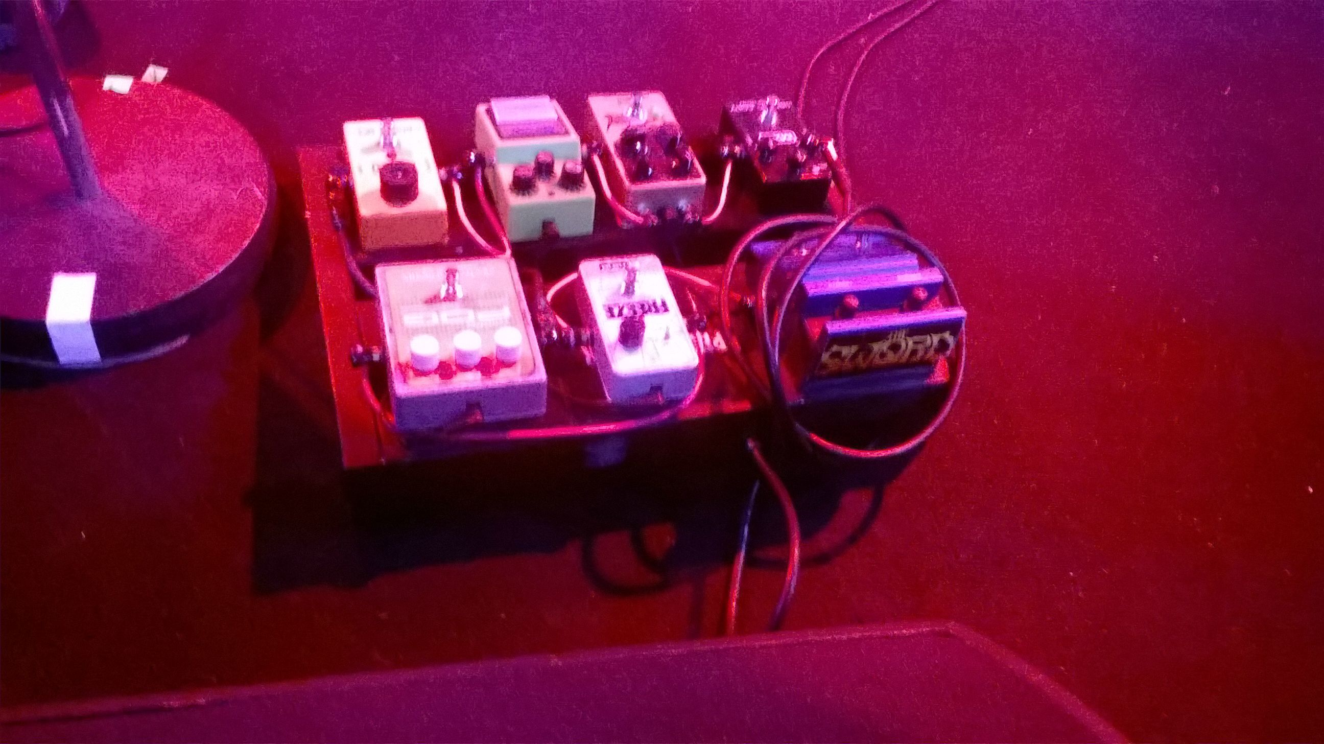 Boss TU-2, Wah Dunlop modifiée, Fultone OCD, Phaser Custom style Small Stone (fabriqué par le bassiste), EQD Levitation