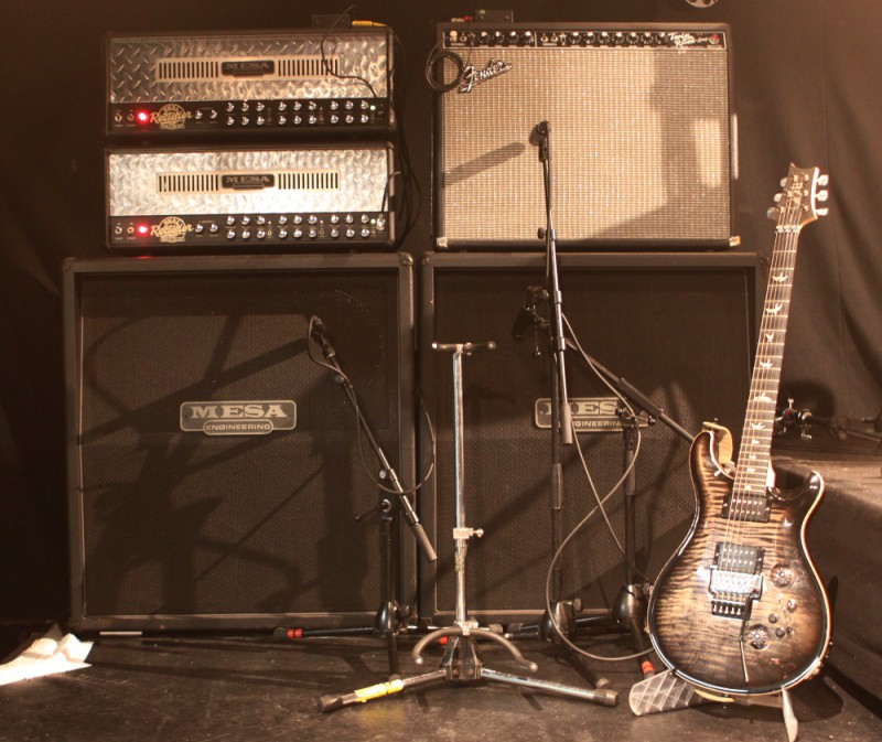 Fender et Marshall c'est la base, autour de ça il fait tourner de temps en temps un 3ème ampli. J'ai pas souvenir de Vox AC particulièrement, mais je l'ai vu avec un Tiny Terror il y a quelques années et... une tête Epi Valve Junior sur 4X12 avant ça