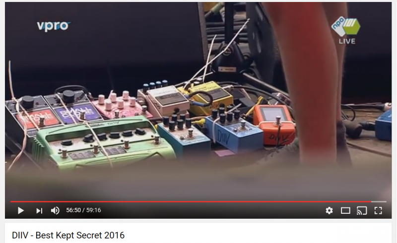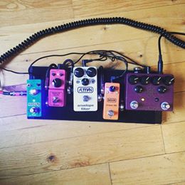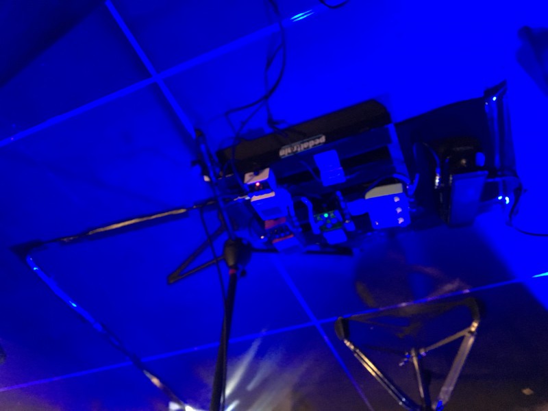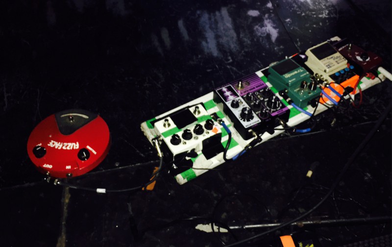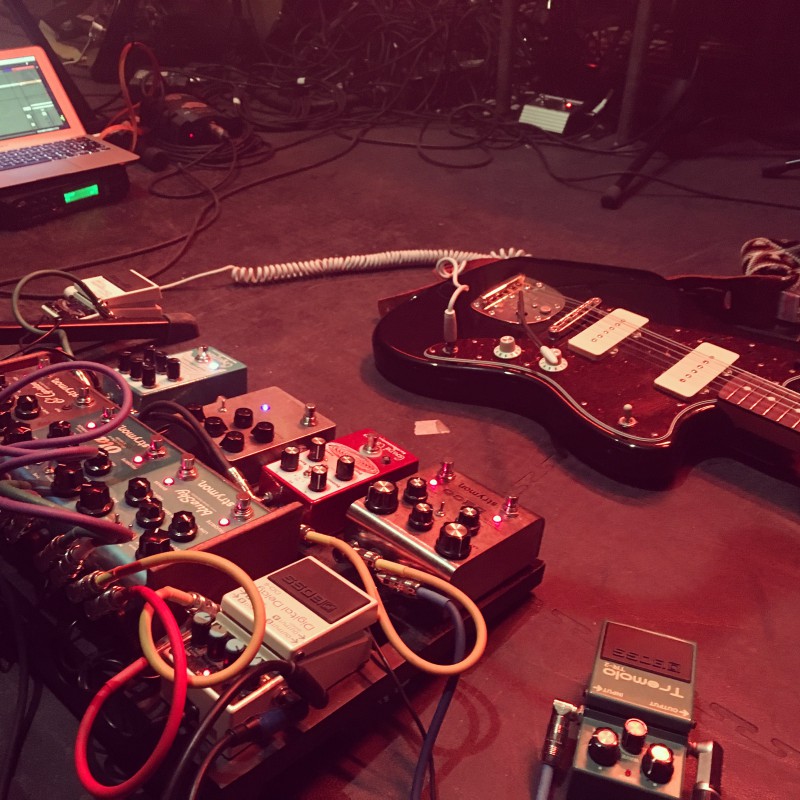 Pas grand chose sur le board,simple mais efficace: une wah, un klon, une SD-9, un flanger boss et une DD-7, le tout dans un JcM-900 et un twin reverb :