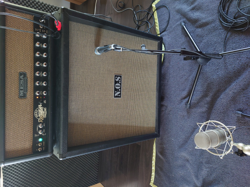 Troisième micro, à l'arrière du cab donc, AT4050 en cardioïde. J'ai mis des panneaux pour éviter certaines réflexions, on en voit 1 sur la photo. Le but c'est de capter l'onde arrière du cab, le "Oumphh" Et donc de comprendre comment ça va se jouer avec la phase à cet endroit là. (sujet évoqué avec Djouby). Il se trouve que j'ai pu le positionner pas trop mal par rapport au Beat57. Sans regarder les formes d'ondes à l'écran, si vous écoutez seul le Beta57, et que vous mettez "ON" le AT4050, vous entendrez "aucun" problème de phase. C'est parce que les micros captent des chosent très différentes. en exagérant, on pourrait dire, pour imager, qu'ils captent chacun ce que l'autre ne capte pas.